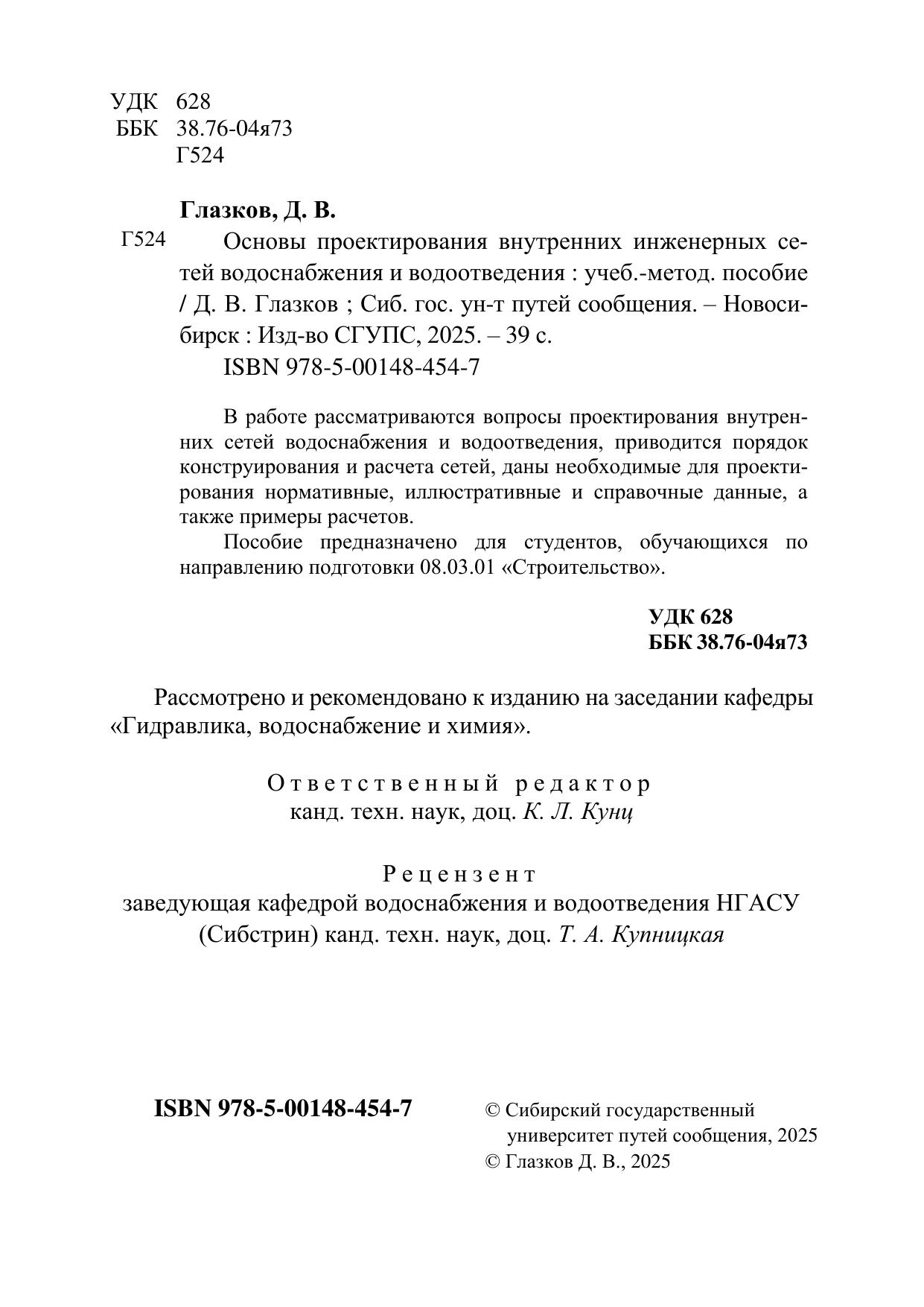 Глазков, Д.В. Основы проектирования внутренних инженерных сетей водоснабжения и водоотведения : учебно-методическое пособие / Д. В. Глазков. — Новосибирск : СГУПС, 2025. — 39 с. — 978-5-00148-454-7. — Текст : электронный // УМЦ ЖДТ : электронная библиотека. — URL: https://umczdt.ru/books/1007/299298/ (дата обращения 08.02.2026). — Режим доступа: по подписке.