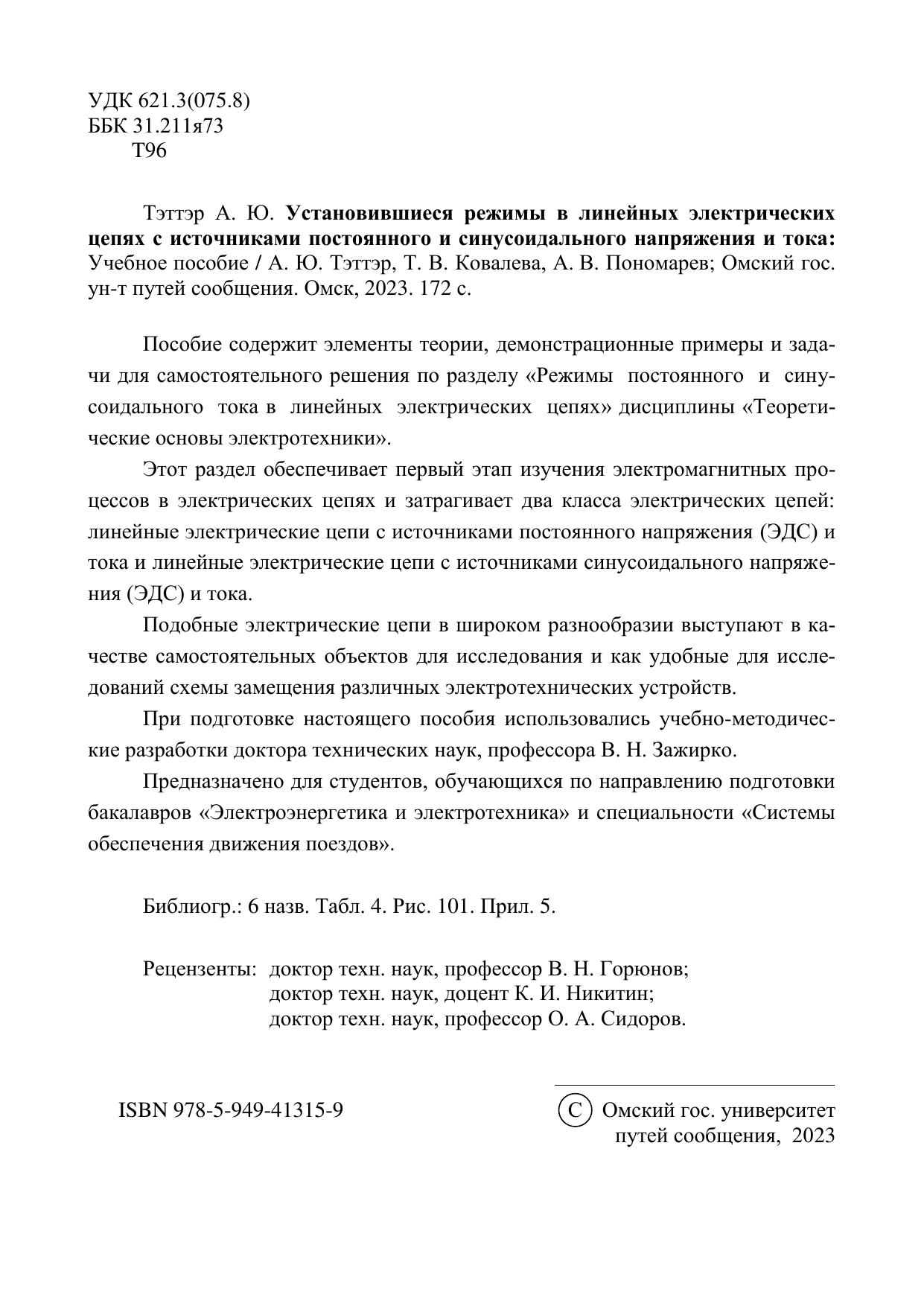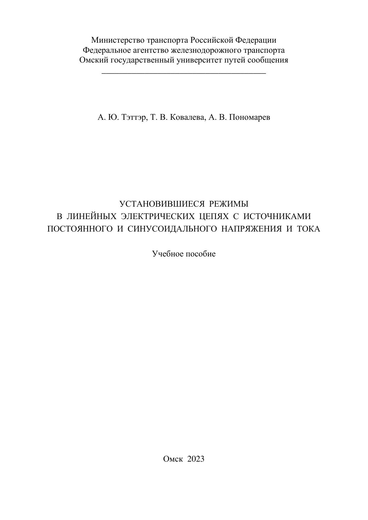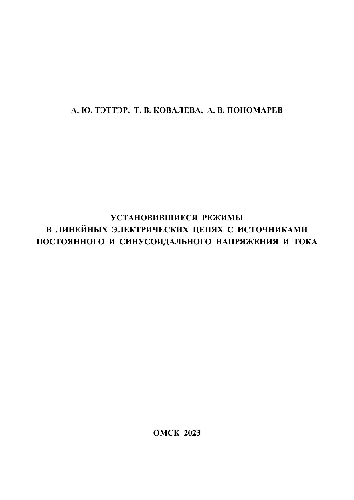 Тэттэр, А.Ю. Установившиеся режимы в линейных электрических цепях с источниками постоянного и синусоидального напряжения и тока : учебник / А. Ю. Тэттэр, Т. В. Ковалева, А. В. Пономарев. — Омск : ОмГУПС, 2023. — 172 с. — Текст : электронный // УМЦ ЖДТ : электронная библиотека. — URL: https://umczdt.ru/books/1212/297549/ (дата обращения 14.02.2026). — Режим доступа: по подписке.