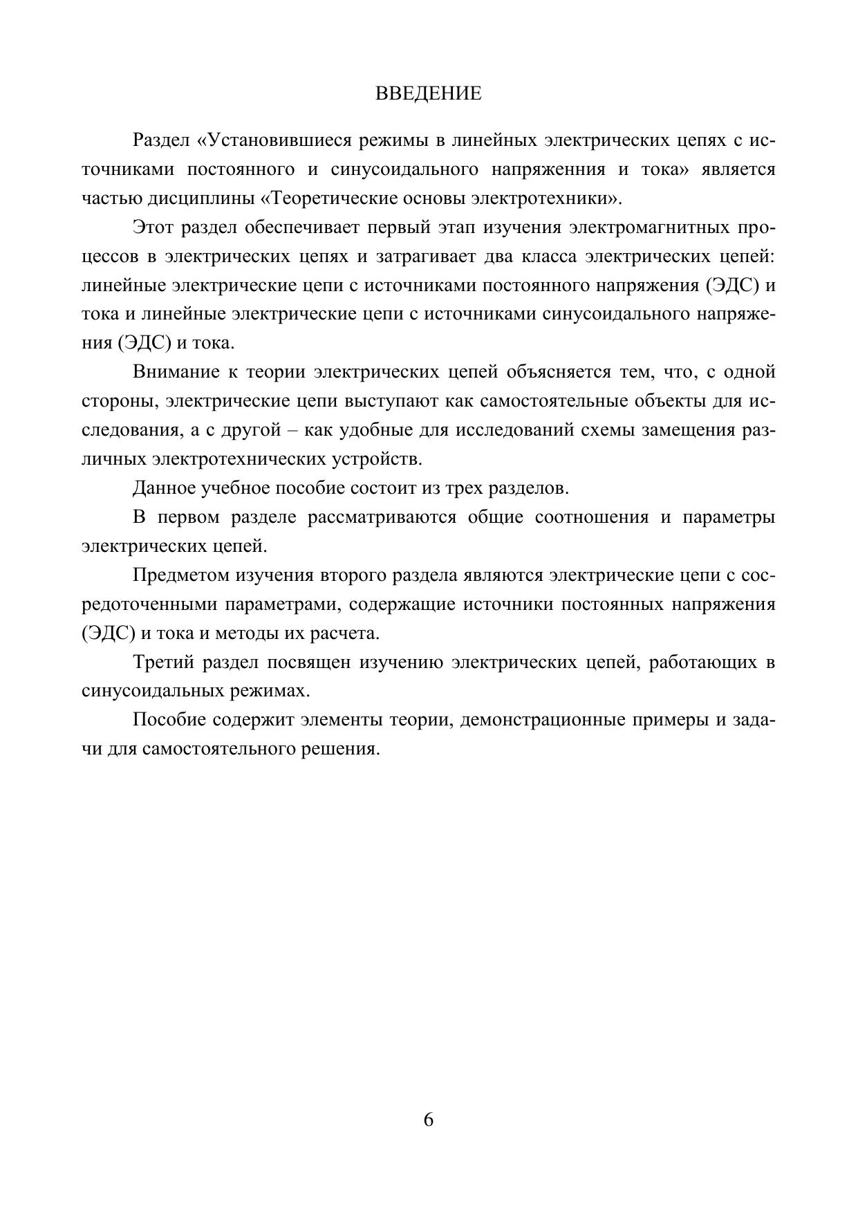 Пособие содержит элементы теории, демонстрационные примеры и задачи для самостоятельного решения по разделу «Режимы постоянного и синусоидального тока в линейных электрических цепях» дисциплины «Теоретические основы электротехники». Этот раздел обеспечивает первый этап изучения электромагнитных процессов в электрических цепях и затрагивает два класса электрических цепей: линейные электрические цепи с источниками постоянного напряжения (ЭДС) и тока и линейные электрические цепи с источниками синусоидального напряжения (ЭДС) и тока. Подобные электрические цепи в широком разнообразии выступают в качестве самостоятельных объектов для исследования и как удобные для исследований схемы замещения различных электротехнических устройств. При подготовке настоящего пособия использовались учебно-методические разработки доктора технических наук, профессора В. Н. Зажирко.