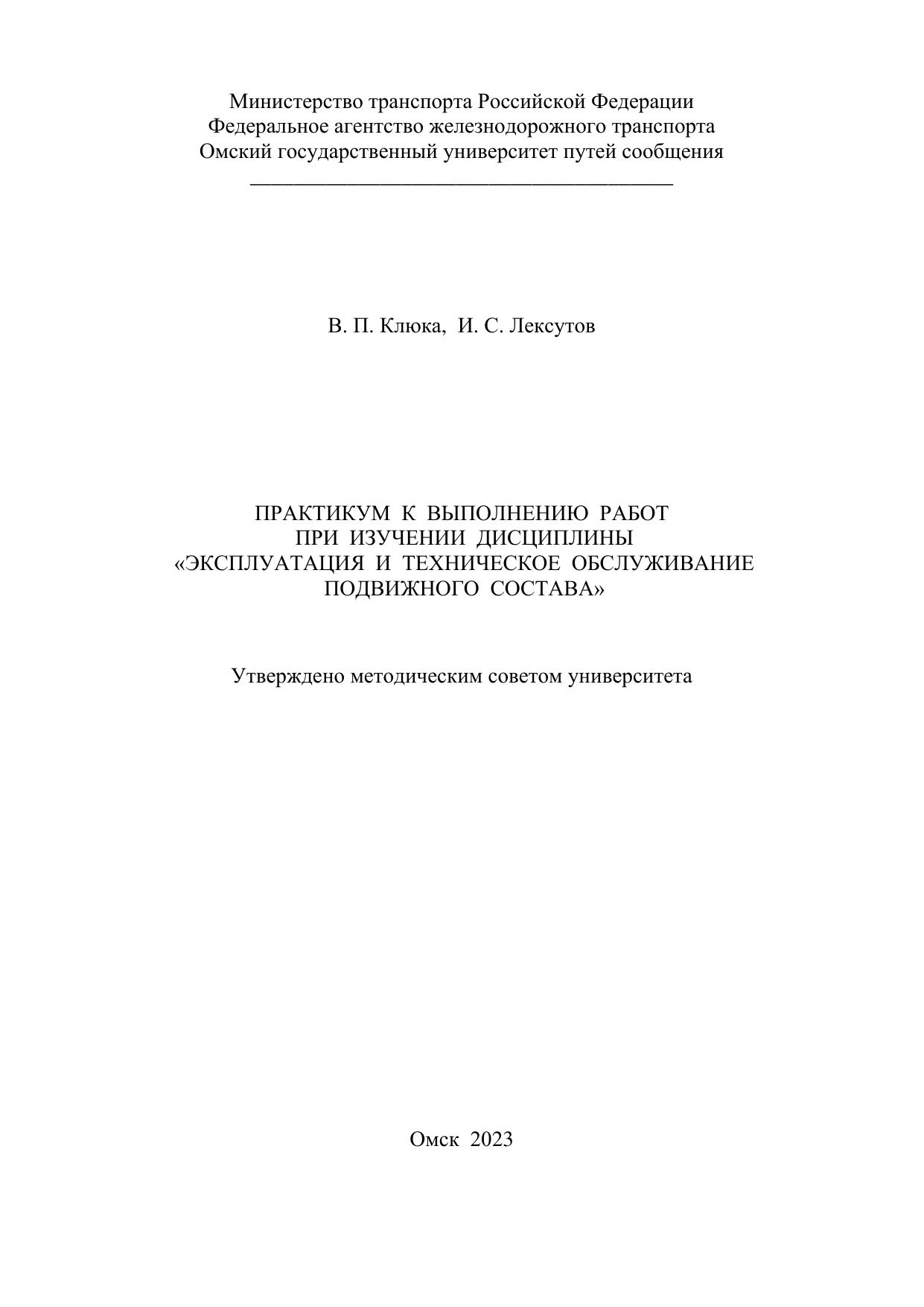 Клюка, В.П. Практикум к выполнению работ при изучении дисциплины «Эксплуатация и техническое обслуживание подвижного состава» : учебник / В. П. Клюка, И. С. Лексутов. — Омск : ОмГУПС, 2023. — 32 с. — Текст : электронный // УМЦ ЖДТ : электронная библиотека. — URL: https://umczdt.ru/books/1212/297563/ (дата обращения 22.01.2026). — Режим доступа: по подписке.