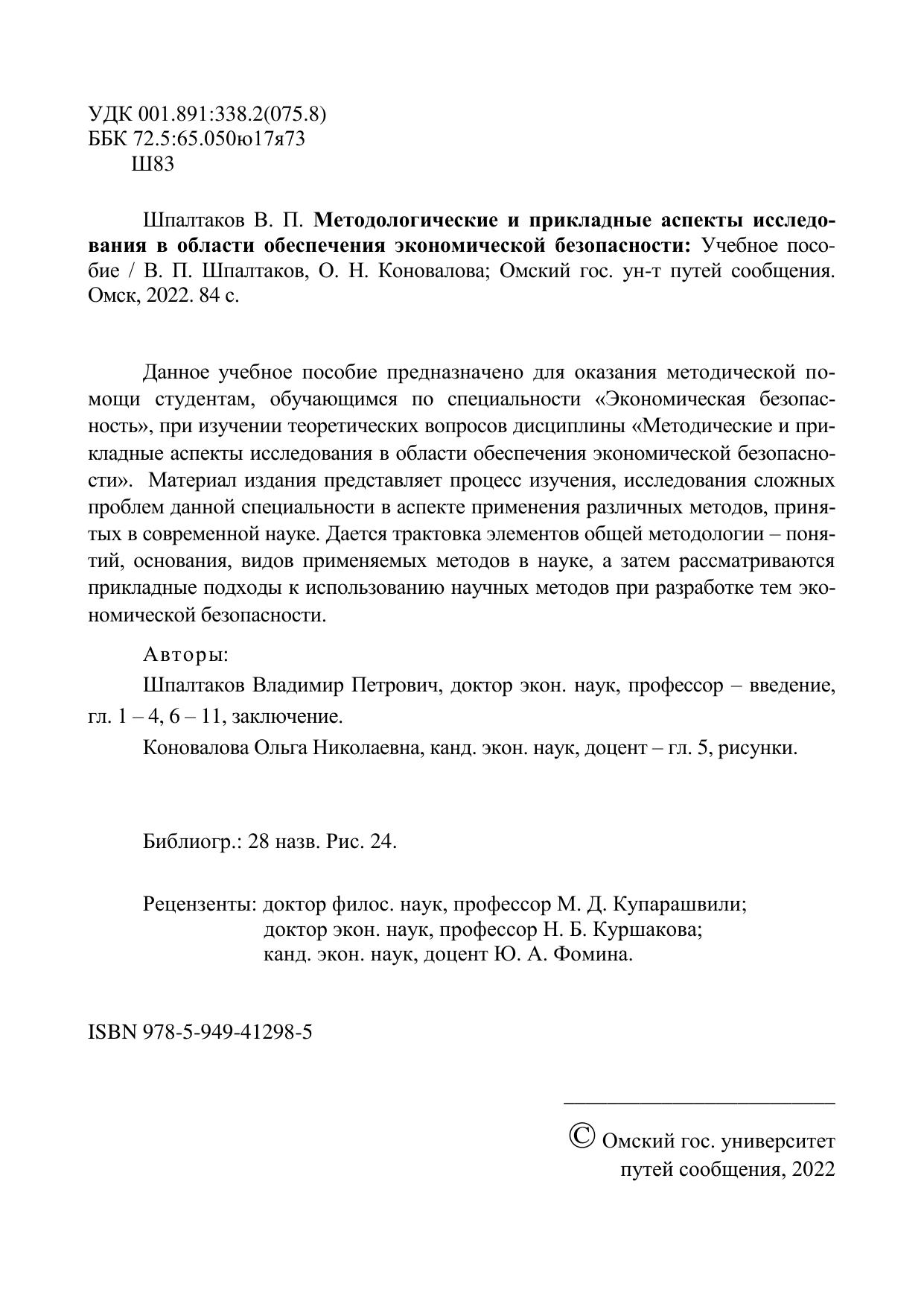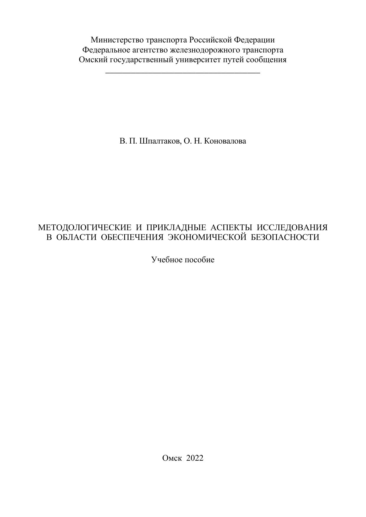 Шпалтаков, В.П. Методологические и прикладные аспекты исследования в области обеспечения экономической безопасности : учебник / В. П. Шпалтаков, О. Н. Коновалова. — Омск : ОмГУПС, 2022. — 84 с. — 978-5-949-41298-5. — Текст : электронный // УМЦ ЖДТ : электронная библиотека. — URL: https://umczdt.ru/books/1212/297571/ (дата обращения 16.01.2026). — Режим доступа: по подписке.