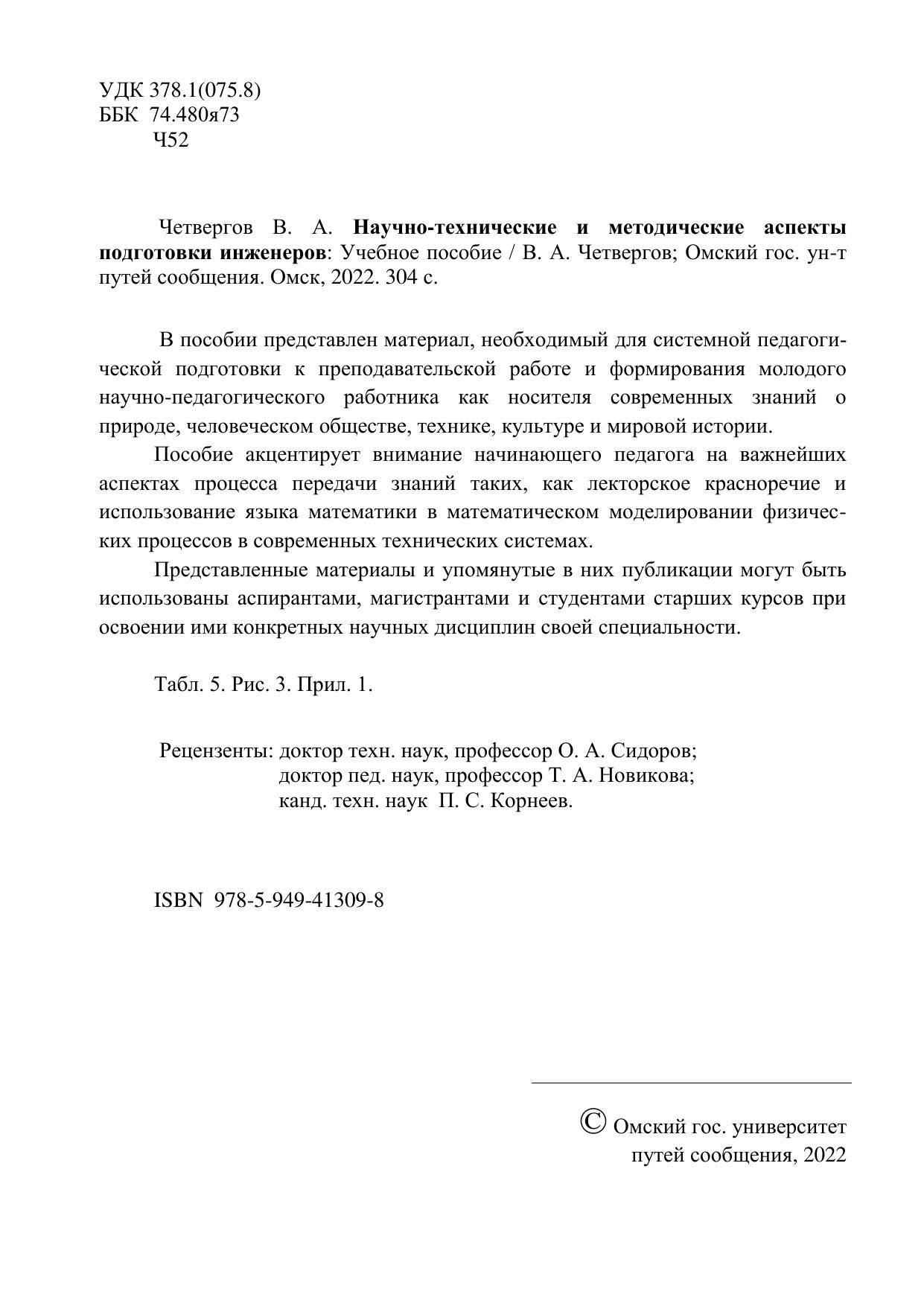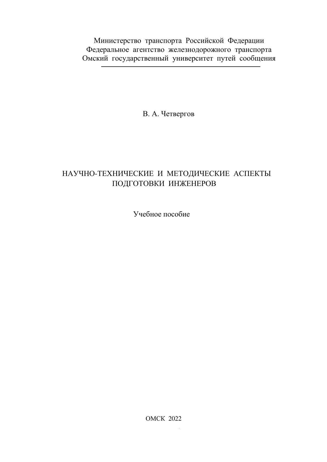 Четвергов, В.А. Научно-технические и методические аспекты подготовки инженеров : учебник / В. А. Четвергов. — Омск : ОмГУПС, 2022. — 304 с. — 978-5-949-41309-8. — Текст : электронный // УМЦ ЖДТ : электронная библиотека. — URL: https://umczdt.ru/books/1212/297574/ (дата обращения 17.01.2026). — Режим доступа: по подписке.