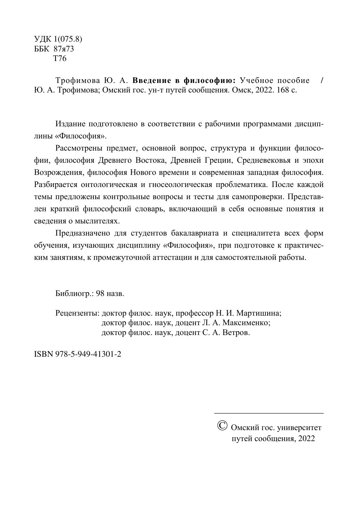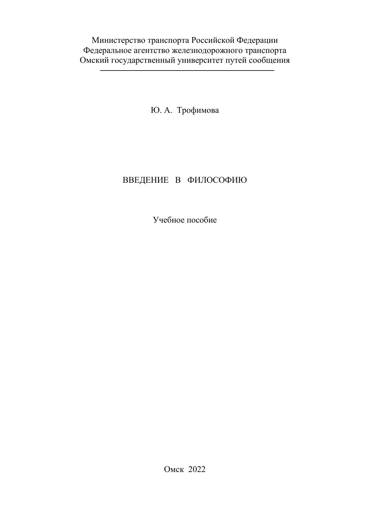 Трофимова, Ю.А. Введение в философию : учебник / Ю. А. Трофимова, Н. И. Мартишина, Л. А. Максименко, С. А. Ветров. — Омск : ОмГУПС, 2022. — 168 с. — 978-5-949-41301-2. — Текст : электронный // УМЦ ЖДТ : электронная библиотека. — URL: https://umczdt.ru/books/1212/297577/ (дата обращения 14.02.2026). — Режим доступа: по подписке.