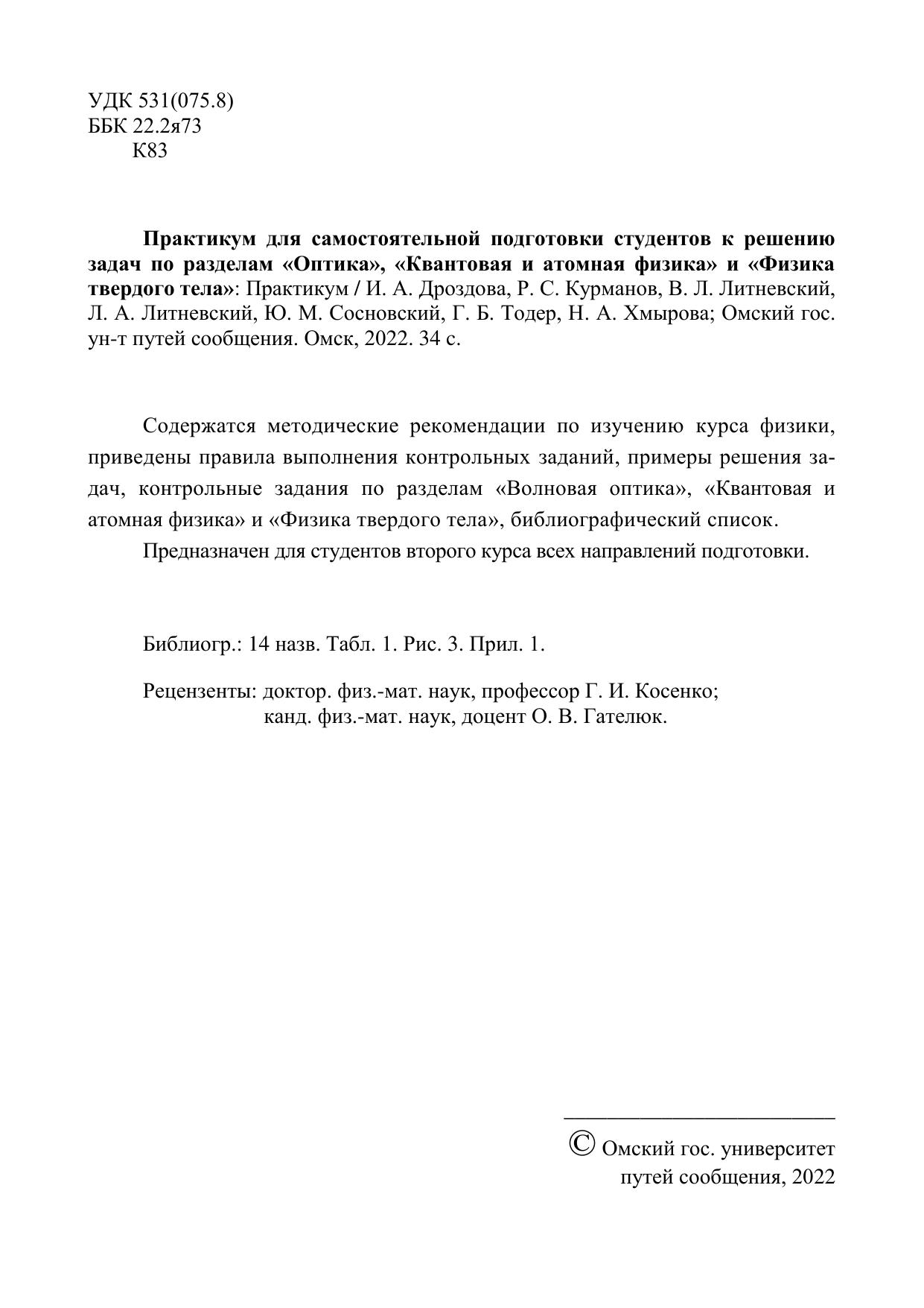 Дроздова, И.А. Практикум для самостоятельной подготовки студентов к решению задач по разделам «Оптика», «Квантовая и атомная физика» и «Физика твердого тела» : учебник / И. А. Дроздова, Р. С. Курманов, В. Л. Литневский, Л. А. Литневский, Ю. М. Сосновский, Г. Б. Тодер, Н. А. Хмырова. — Омск : ОмГУПС, 2022. — 34 с. — Текст : электронный // УМЦ ЖДТ : электронная библиотека. — URL: https://umczdt.ru/books/1212/297588/ (дата обращения 07.02.2026). — Режим доступа: по подписке.