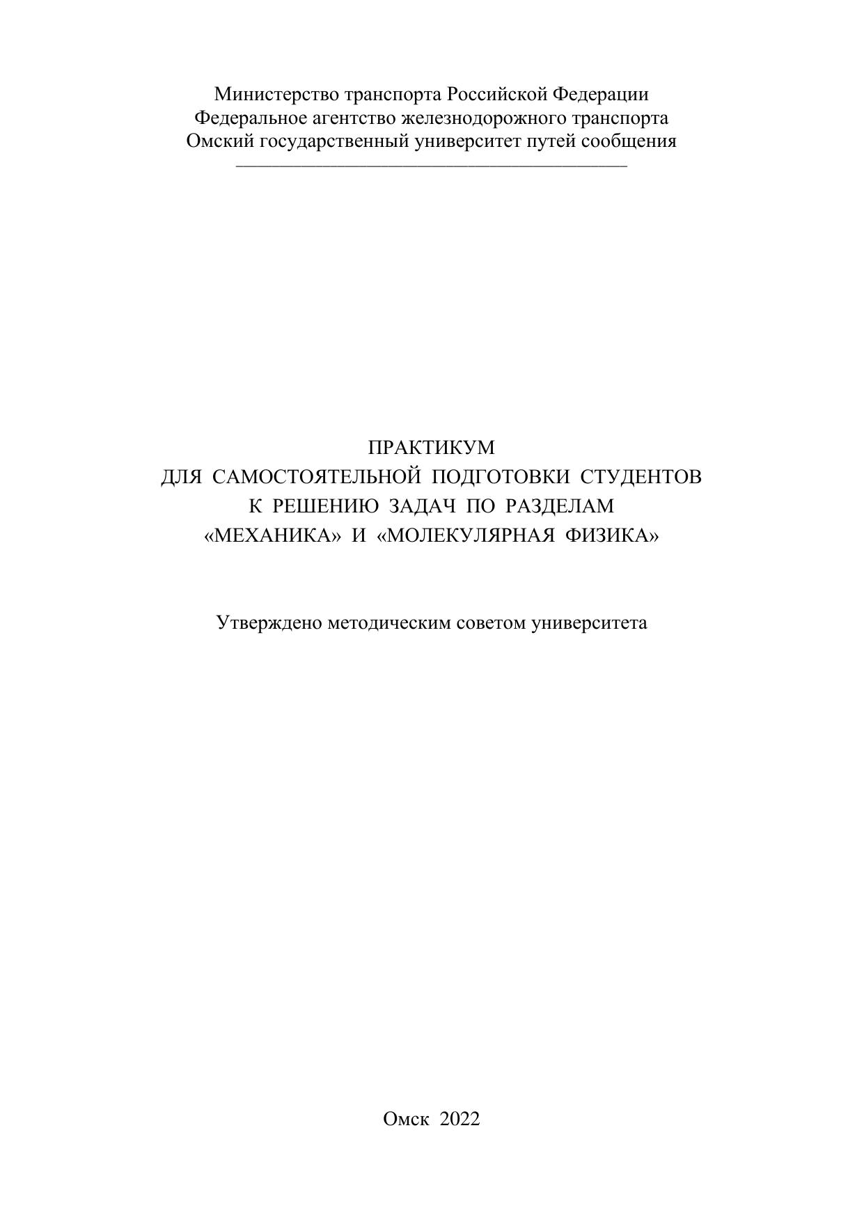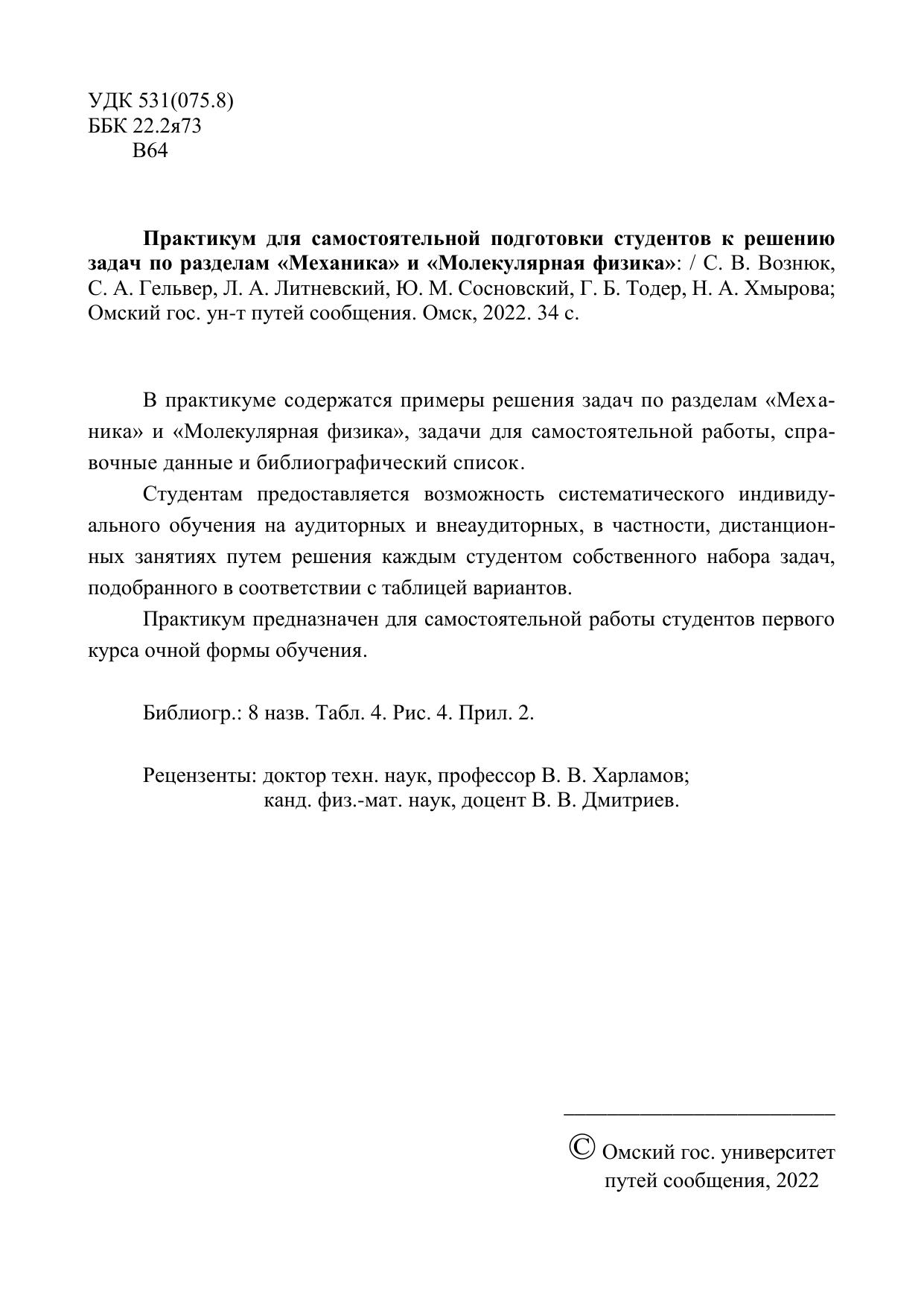 Вознюк, С.В. Практикум для самостоятельной подготовки студентов к решению задач по разделам «Механика» и «Молекулярная физика» : учебник / С. В. Вознюк, С. А. Гельвер, Л. А. Литневский, Ю. М. Сосновский, Г. Б. Тодер, Н. А. Хмырова. — Омск : ОмГУПС, 2022. — 34 с. — Текст : электронный // УМЦ ЖДТ : электронная библиотека. — URL: https://umczdt.ru/books/1212/297590/ (дата обращения 20.01.2026). — Режим доступа: по подписке.