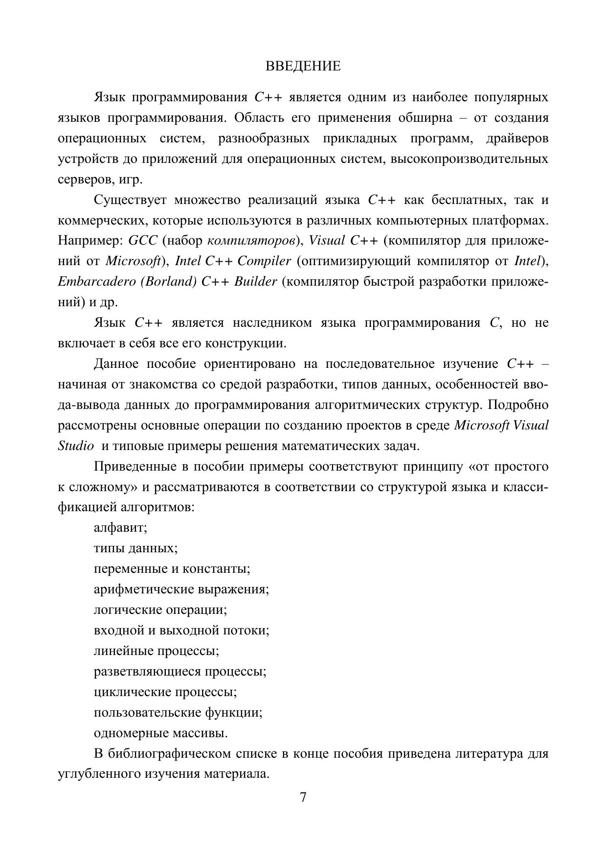 Рассмотрены особенности языка программирования С++, порядок разработки приложений в интегрированной среде Microsoft Visual Studio средствами Visual С++, программирование базовых структур алгоритмов и их реализация при решении вычислительных задач. Структура учебного пособия представляет собой изложение теоретического и практического материала, в котором представлены основные подходы к созданию проектов в соответствии с особенностями языка С++ и программируемых алгоритмов. Предназначено для студентов и аспирантов очной и заочной форм обучения всех специальностей (направлений подготовки), изучающих основы программирования на языке С++. Может быть использовано в качестве пособия для самостоятельной работы при изучении программирования для пользователей с начальным уровнем подготовки. Библиогр.: 5 назв. Табл. 6. Рис. 50.