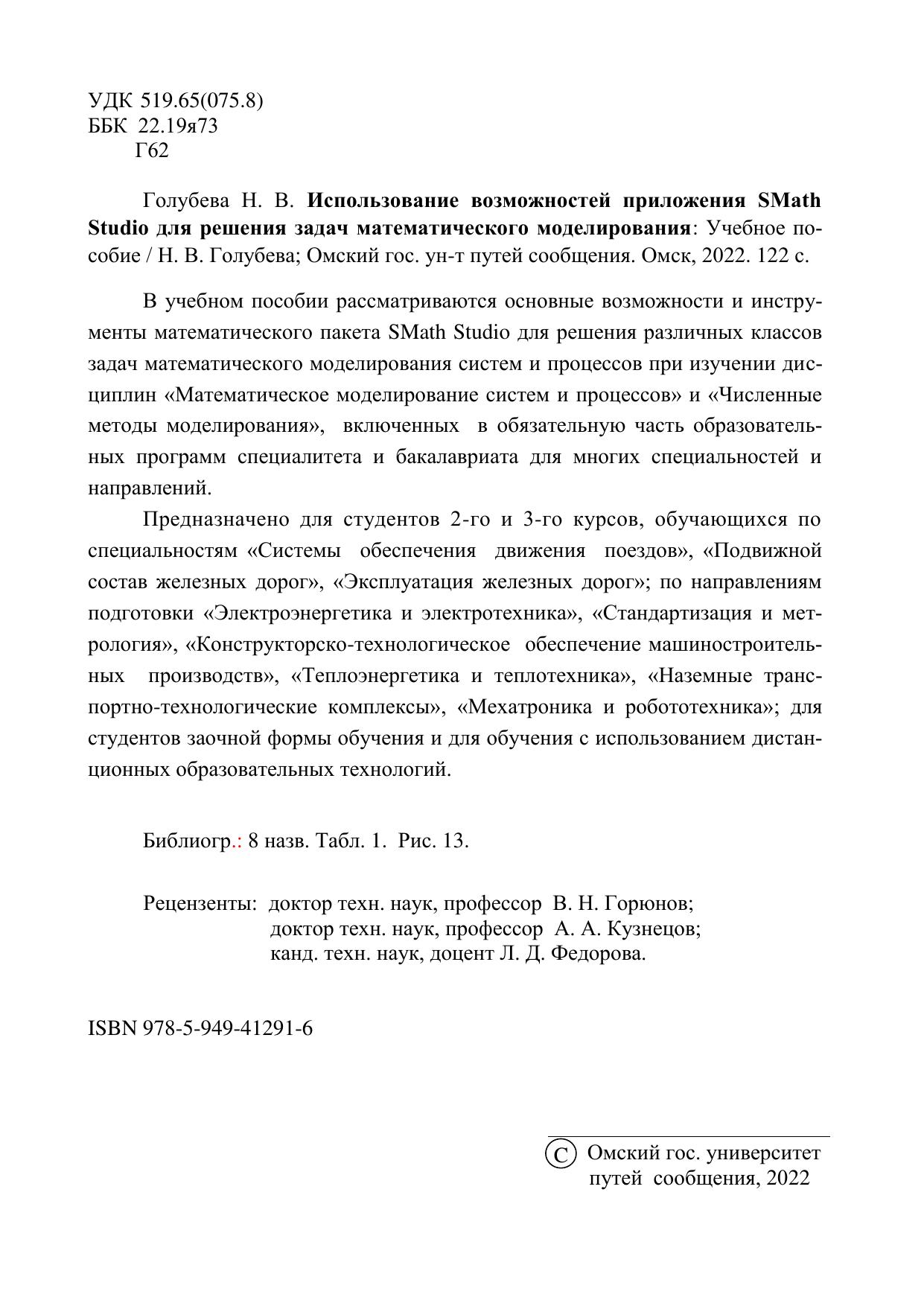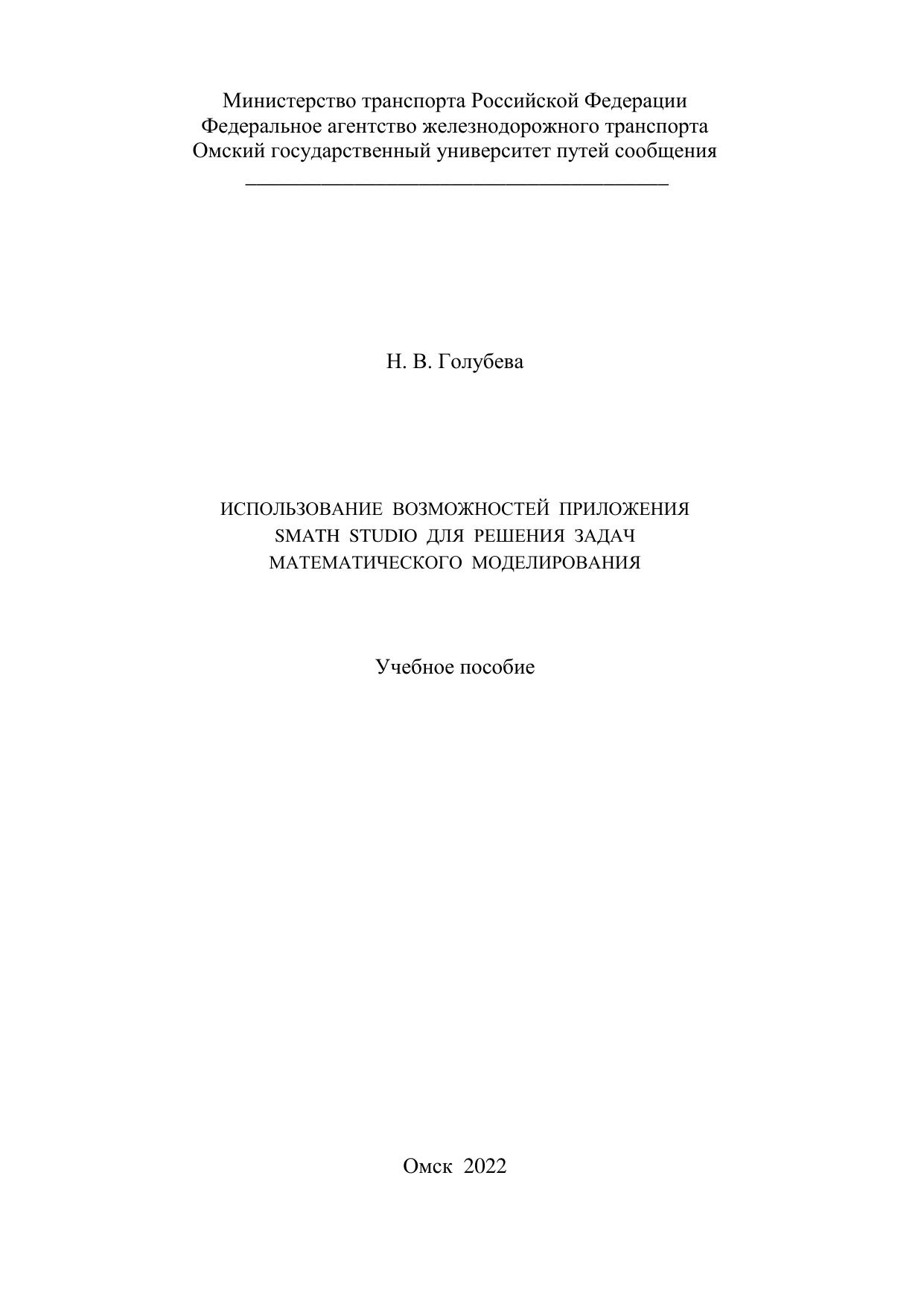 Голубева, Н.В. Использование возможностей приложения SMath Studio для решения задач математического моделирования : учебник / Н. В. Голубева. — Омск : ОмГУПС, 2022. — 122 с. — 978-5-949-41291-6. — Текст : электронный // УМЦ ЖДТ : электронная библиотека. — URL: https://umczdt.ru/books/1212/297597/ (дата обращения 13.02.2026). — Режим доступа: по подписке.