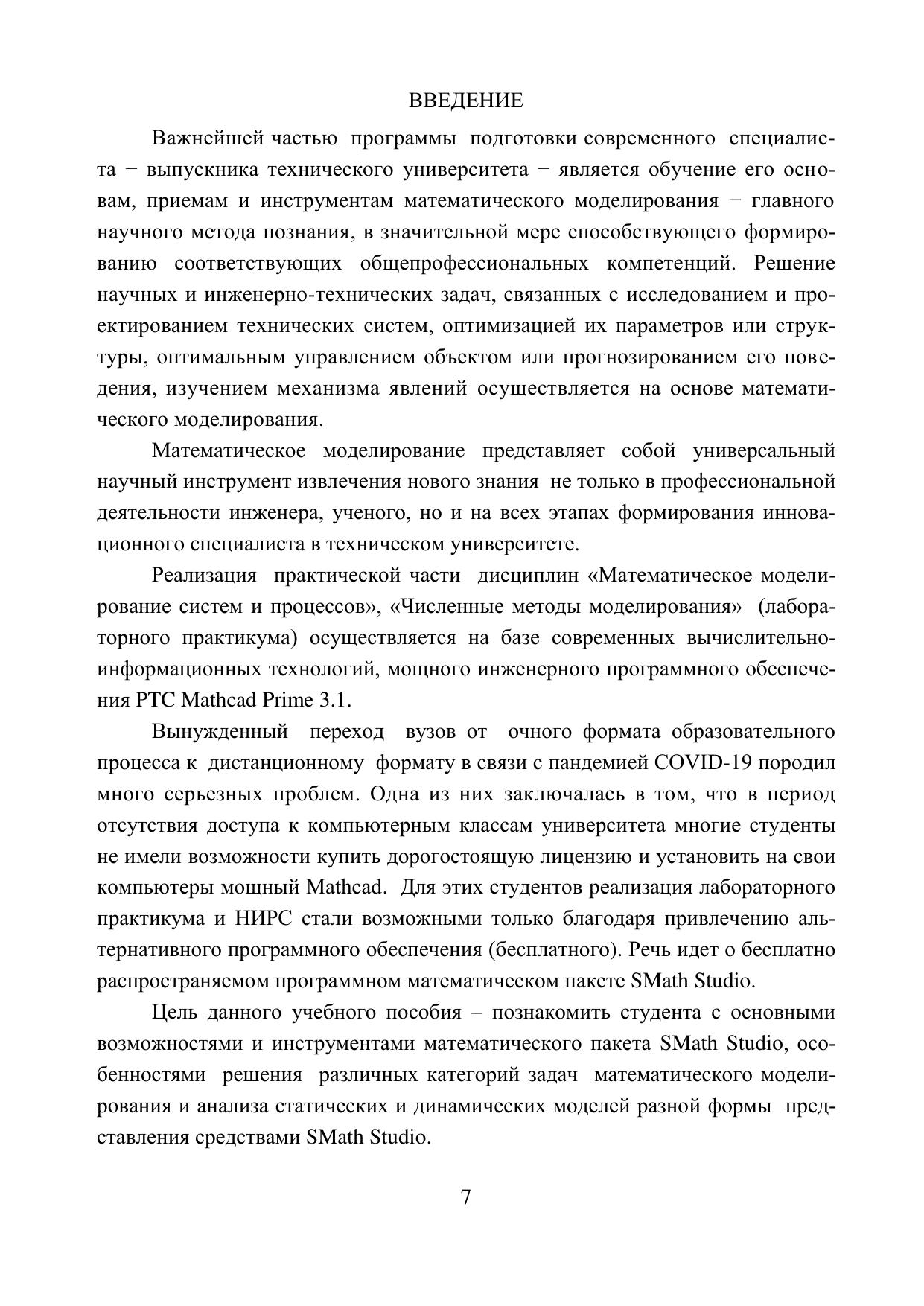 В учебном пособии рассматриваются основные возможности и инструменты математического пакета SMath Studio для решения различных классов задач математического моделирования систем и процессов при изучении дисциплин «Математическое моделирование систем и процессов» и «Численные методы моделирования», включенных в обязательную часть образовательных программ специалитета и бакалавриата для многих специальностей и направлений. Предназначено для студентов 2-го и 3-го курсов, обучающихся по специальностям «Системы обеспечения движения поездов», «Подвижной состав железных дорог», «Эксплуатация железных дорог»; по направлениям подготовки «Электроэнергетика и электротехника», «Стандартизация и метрология», «Конструкторско-технологическое обеспечение машиностроительных производств», «Теплоэнергетика и теплотехника», «Наземные транспортно-технологические комплексы», «Мехатроника и робототехника»; для студентов заочной формы обучения и для обучения с использованием дистанционных образовательных технологий.               Библиогр.: 8 назв. Табл. 1. Рис. 13.