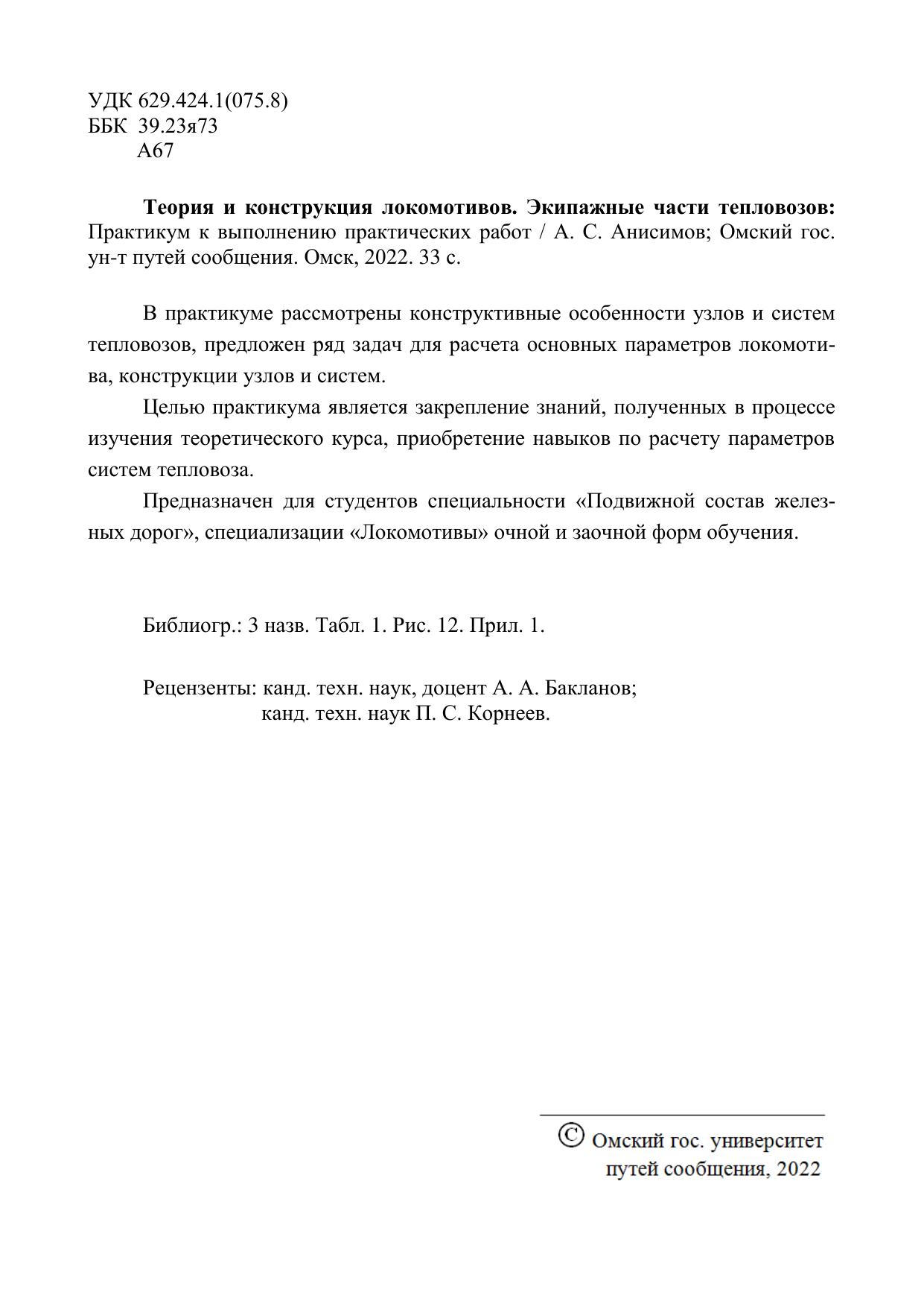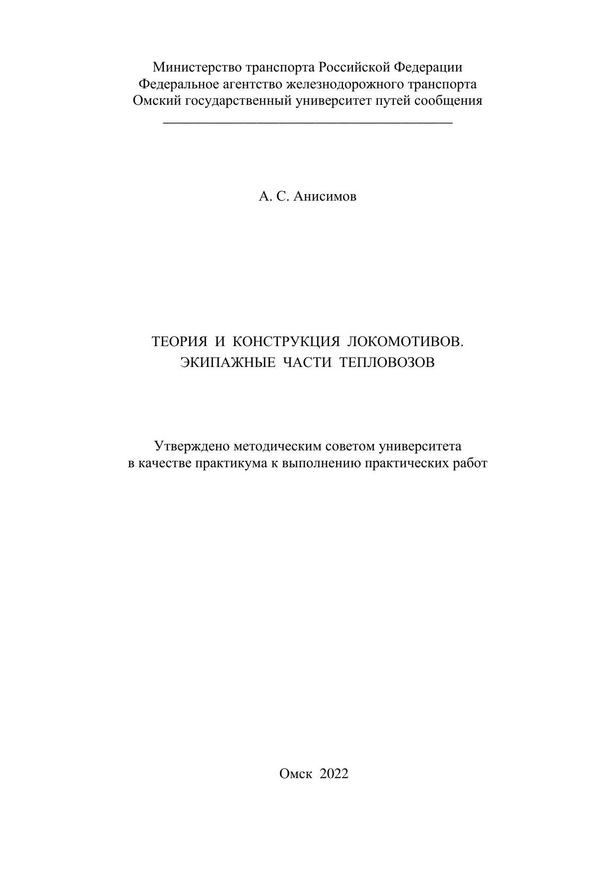 Анисимов, А.С. Теория и конструкция локомотивов. Экипажные части тепловозов: Практикум к выполнению практических работ : учебник / А. С. Анисимов. — Омск : ОмГУПС, 2022. — 33 с. — Текст : электронный // УМЦ ЖДТ : электронная библиотека. — URL: https://umczdt.ru/books/1212/297600/ (дата обращения 20.01.2026). — Режим доступа: по подписке.