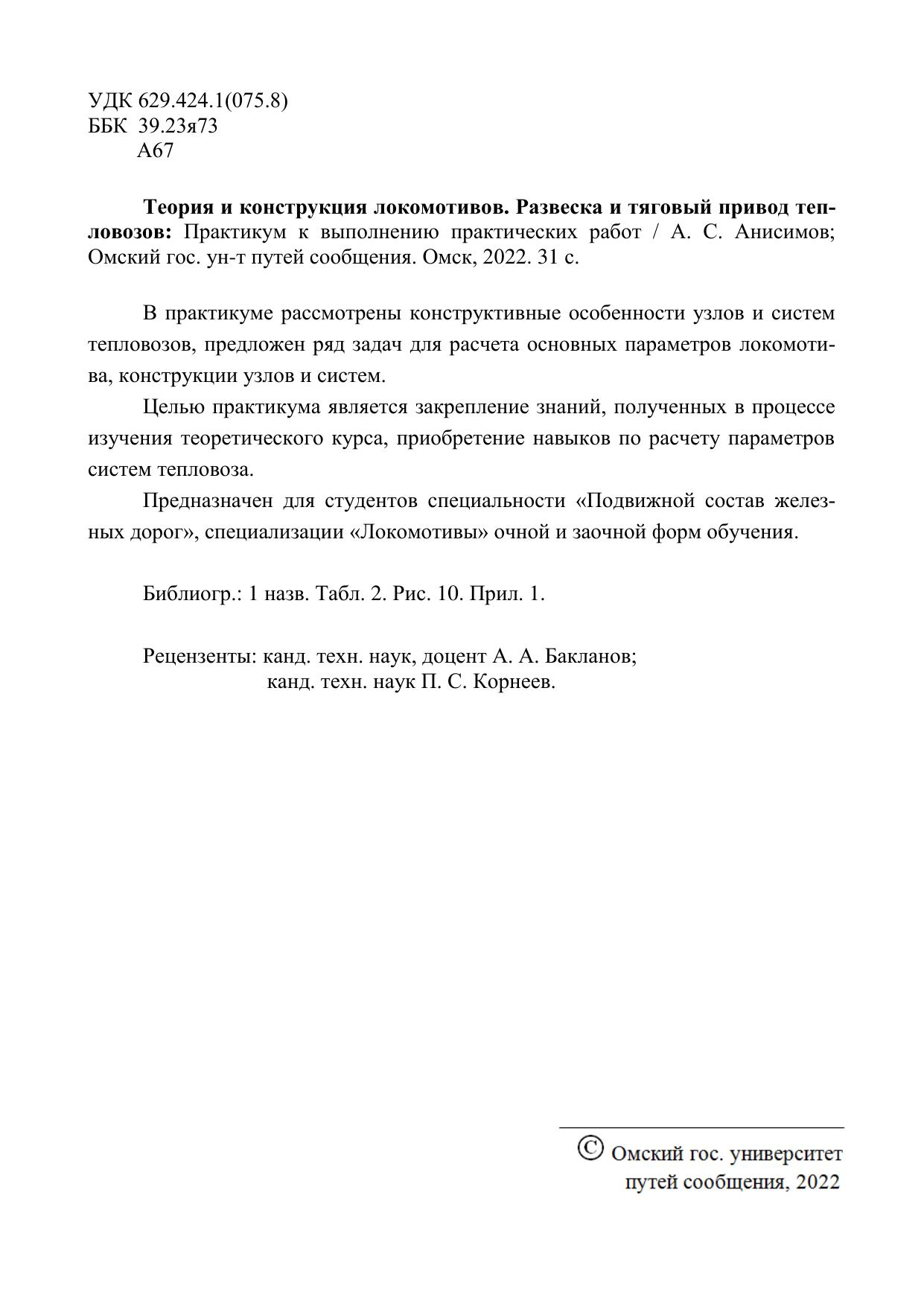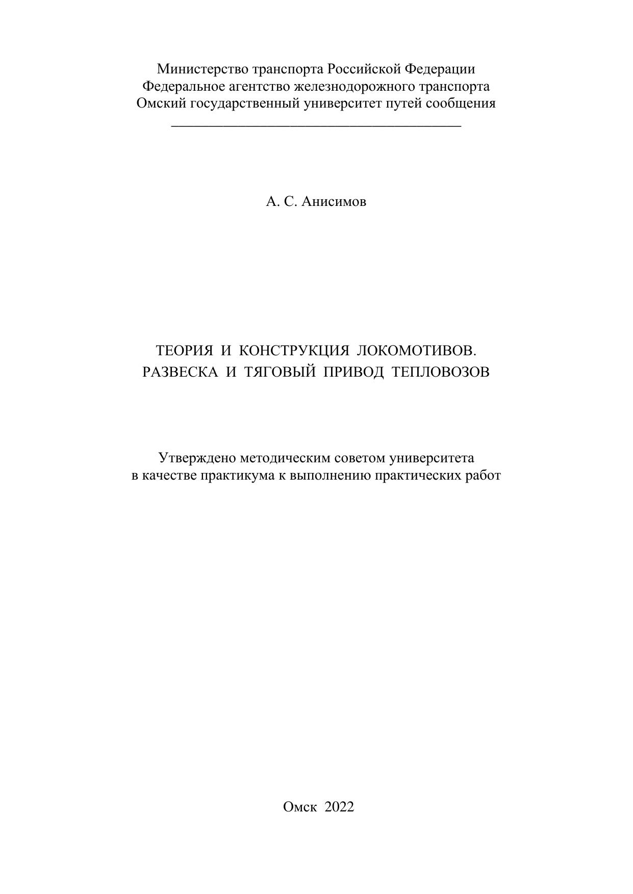 Анисимов, А.С. Теория и конструкция локомотивов. Развеска и тяговый привод тепловозов: Практикум к выполнению практических работ : учебник / А. С. Анисимов. — Омск : ОмГУПС, 2022. — 31 с. — Текст : электронный // УМЦ ЖДТ : электронная библиотека. — URL: https://umczdt.ru/books/1212/297601/ (дата обращения 23.01.2026). — Режим доступа: по подписке.