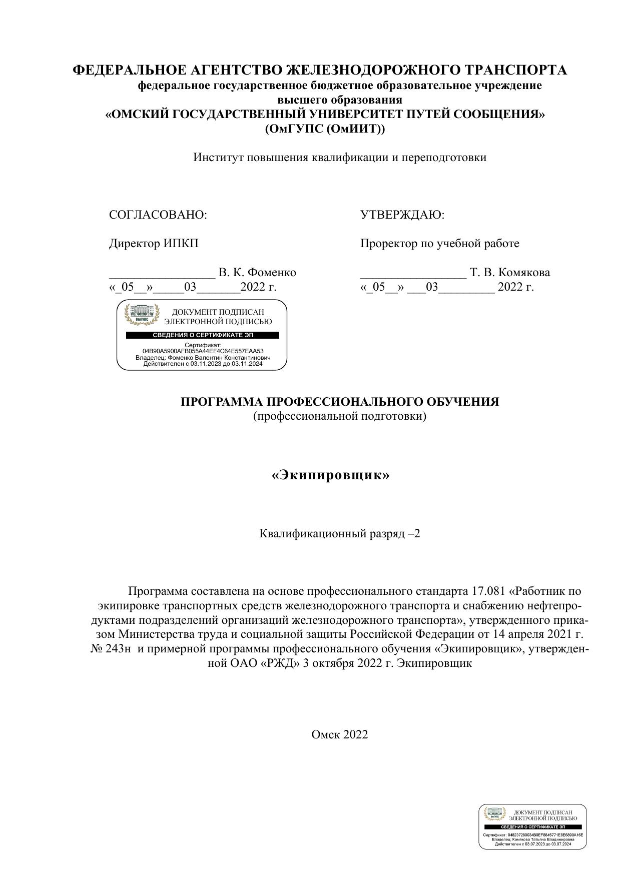 Экипировщик : программа профессиональной подготовки / . — Омск : ОмГУПС, 2022. — 34 с. — Текст : электронный // УМЦ ЖДТ : электронная библиотека. — URL: https://umczdt.ru/books/1212/299723/ (дата обращения 14.04.2026). — Режим доступа: по подписке.