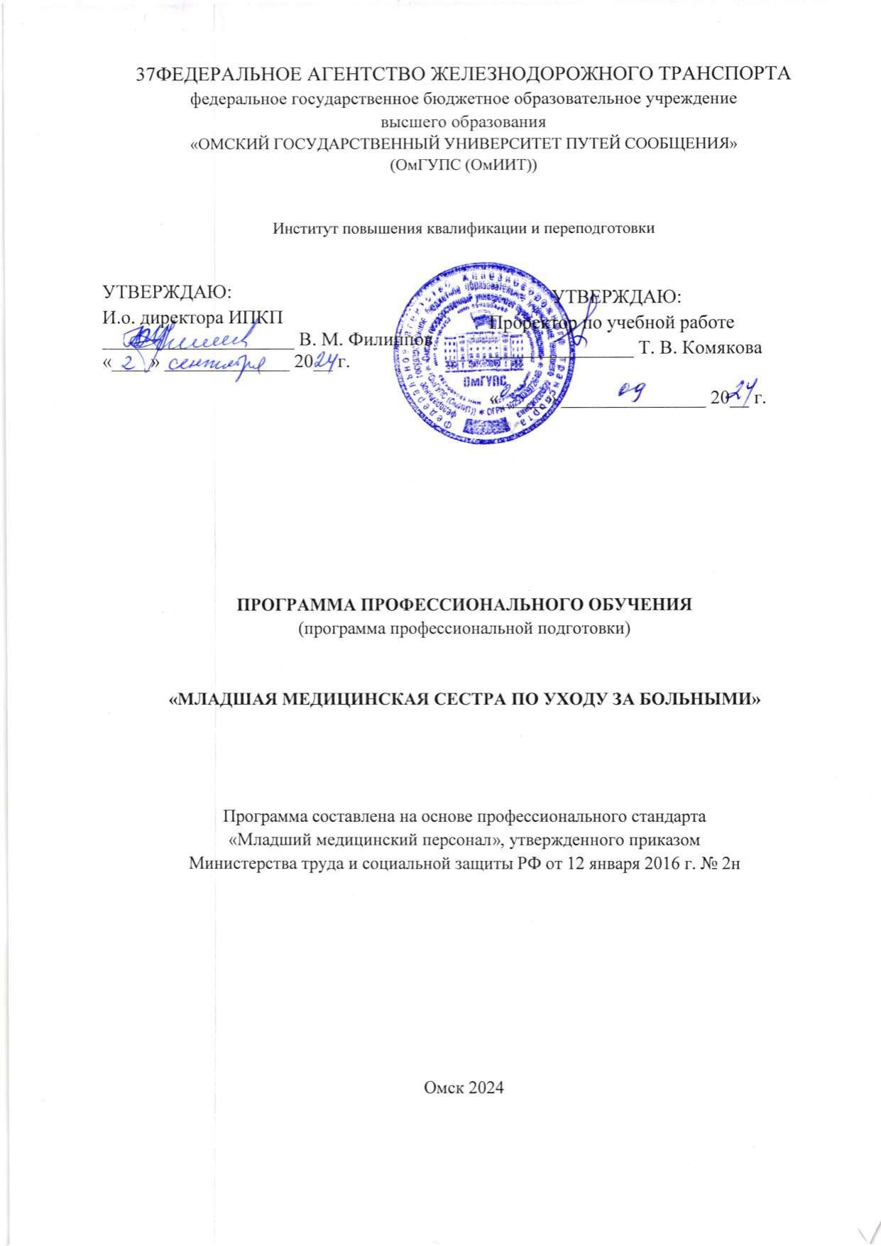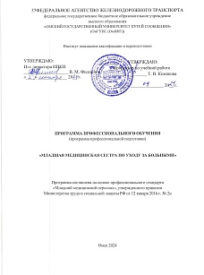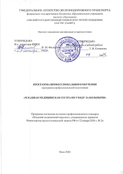 Младшая медицинская сестра по уходу за больными : программа профессиональной подготовки / . — Омск : ОмГУПС, 2024. — 39 с. — Текст : электронный // УМЦ ЖДТ : электронная библиотека. — URL: https://umczdt.ru/books/1212/299741/ (дата обращения 12.03.2026). — Режим доступа: по подписке.