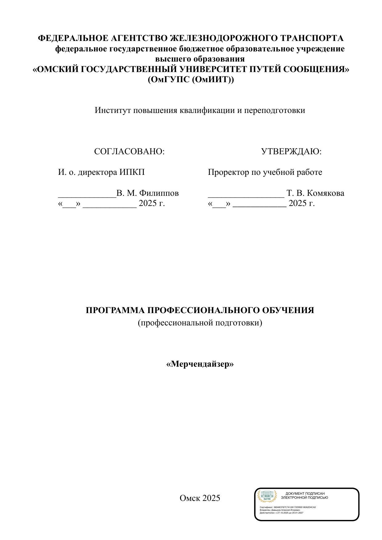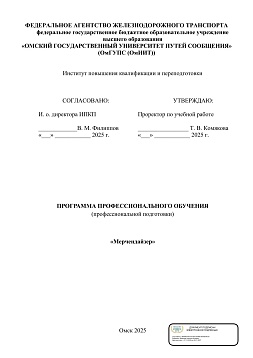 Мерчендайзер : программа профессиональной подготовки / . — Омск : ОмГУПС, 2025. — 11 с. — Текст : электронный // УМЦ ЖДТ : электронная библиотека. — URL: https://umczdt.ru/books/1212/299742/ (дата обращения 12.03.2026). — Режим доступа: по подписке.