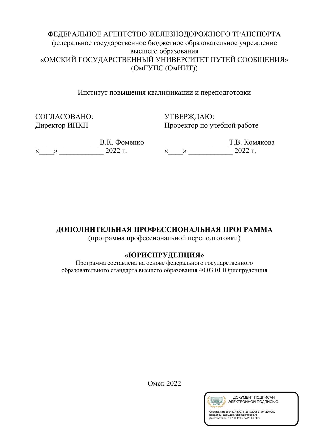 Юриспруденция : программа профессиональной переподготовки / . — Омск : ОмГУПС, 2022. — 42 с. — Текст : электронный // УМЦ ЖДТ : электронная библиотека. — URL: https://umczdt.ru/books/1212/299753/ (дата обращения 12.03.2026). — Режим доступа: по подписке.