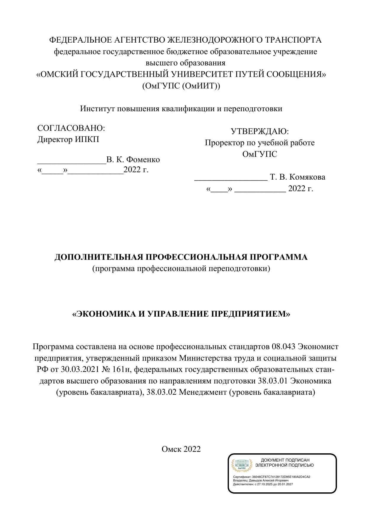 Экономика и управление предприятием : программа профессиональной переподготовки / . — Омск : ОмГУПС, 2022. — 51 с. — Текст : электронный // УМЦ ЖДТ : электронная библиотека. — URL: https://umczdt.ru/books/1212/299758/ (дата обращения 12.03.2026). — Режим доступа: по подписке.