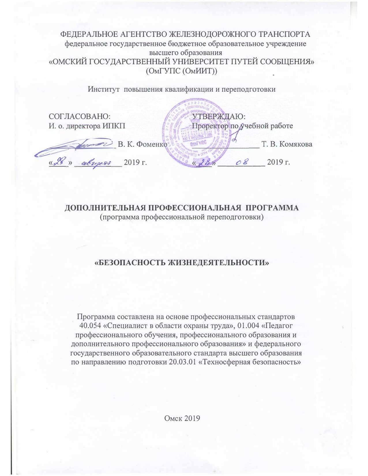 Безопасность жизнидеятельности : программа профессиональной переподготовки / . — Омск : ОмГУПС, 2019. — 18 с. — Текст : электронный // УМЦ ЖДТ : электронная библиотека. — URL: https://umczdt.ru/books/1212/299789/ (дата обращения 16.04.2026). — Режим доступа: по подписке.