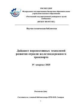 Сокирка, О.П. Дайджест перспективных технологий развития отрасли железнодорожного транспорта IV квартал 2025 : дайджест / О. П. Сокирка. — Ростов-на-Дону : РГУПС, 2025. — 108 с. — Текст : электронный // УМЦ ЖДТ : электронная библиотека. — URL: https://umczdt.ru/books/1214/299950/ (дата обращения 15.04.2026). — Режим доступа: по подписке.