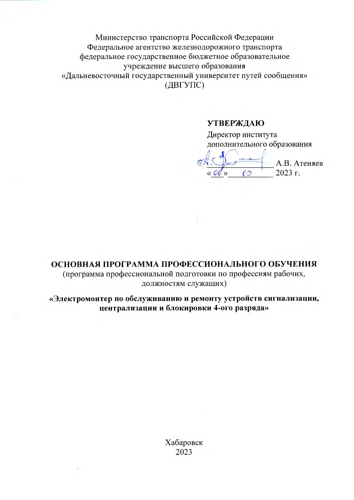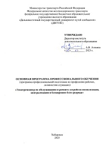 Электромонтер по обслуживанию и ремонту устройств сигнализации, централизации и блокировки 4-го разряда : учебный план / . — Хабаровск : ДвГУПС, 2023. — 4 с. — Текст : электронный // УМЦ ЖДТ : электронная библиотека. — URL: https://umczdt.ru/books/1215/299607/ (дата обращения 16.04.2026). — Режим доступа: по подписке.