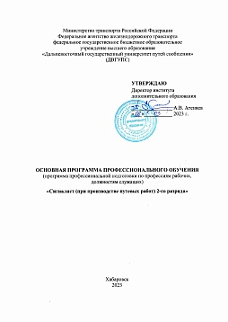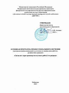 Сигналист (при производстве путевых работ) 2-го разряда : учебный план / . — Хабаровск : ДвГУПС, 2023. — 3 с. — Текст : электронный // УМЦ ЖДТ : электронная библиотека. — URL: https://umczdt.ru/books/1215/299609/ (дата обращения 19.04.2026). — Режим доступа: по подписке.