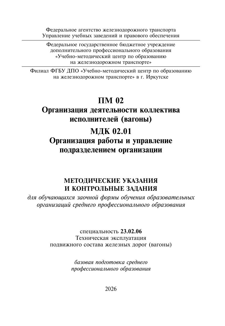 Иванова, В.Ю. Методические указания и контрольные задания для обучающихся заочной формы обучения образовательных организаций среднего профессионального образования ПМ 02 Организация деятельности коллектива исполнителей (вагоны) МДК 02.01 Организация работы и управление : методическое пособие / В. Ю. Иванова. — Москва : УМЦ ЖДТ, 2026. — 32 с. — Текст : электронный // УМЦ ЖДТ : электронная библиотека. — URL: https://umczdt.ru/books/1233/300730/ (дата обращения 15.04.2026). — Режим доступа: по подписке.