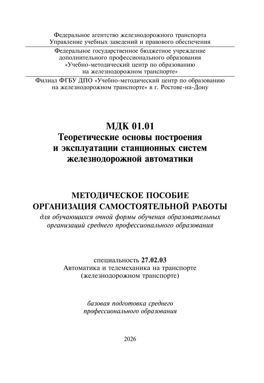 Некрасова, С.В. Методическое пособие Организация самостоятельной работы для обучающихся очной формы обучения образовательных организаций среднего профессионального образования МДК 01.01 Теоретические основы построения и эксплуатации станционных систем железнодорожной авт : методическое пособие / С. В. Некрасова. — Москва : УМЦ ЖДТ, 2026. — 76 с. — Текст : электронный // УМЦ ЖДТ : электронная библиотека. — URL: https://umczdt.ru/books/1236/300681/ (дата обращения 01.05.2026). — Режим доступа: по подписке.