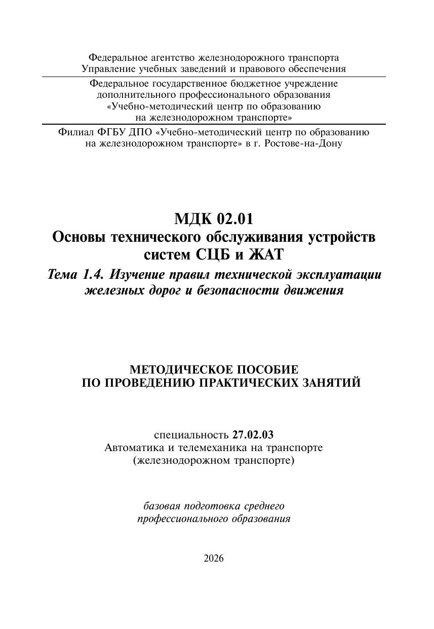 Осадчук, С.В. Методическое пособие по проведению практических занятий МДК 02.01 Основы технического обслуживания устройств систем СЦБ и ЖАТ. Тема 1.4. Изучение правил технической эксплуатации железных дорог и безопасности движения : методическое пособие / С. В. Осадчук. — Москва : УМЦ ЖДТ, 2026. — 28 с. — Текст : электронный // УМЦ ЖДТ : электронная библиотека. — URL: https://umczdt.ru/books/1236/300683/ (дата обращения 30.04.2026). — Режим доступа: по подписке.
