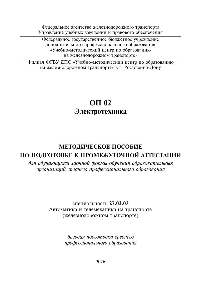 Сорочан, Н.В. Методическое пособие по подготовке к промежуточной аттестации для обучающихся заочной формы обучения образовательных организаций среднего профессионального образования ОП 02 Электротехника : монография / Н. В. Сорочан. — Москва : УМЦ ЖДТ, 2026. — 128 с. — Текст : электронный // УМЦ ЖДТ : электронная библиотека. — URL: https://umczdt.ru/books/1236/300686/ (дата обращения 30.04.2026). — Режим доступа: по подписке.
