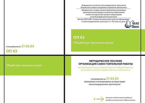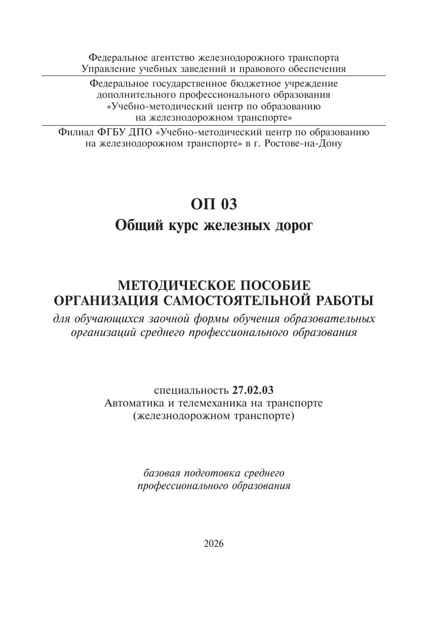 Капралова, М.А. Методическое пособие Организация самостоятельной работы для обучающихся заочной формы обучения образовательных организаций среднего профессионального образования ОП 03 Общий курс железных дорог : методическое пособие / М. А. Капралова. — Москва : УМЦ ЖДТ, 2026. — 100 с. — Текст : электронный // УМЦ ЖДТ : электронная библиотека. — URL: https://umczdt.ru/books/1236/300690/ (дата обращения 30.04.2026). — Режим доступа: по подписке.