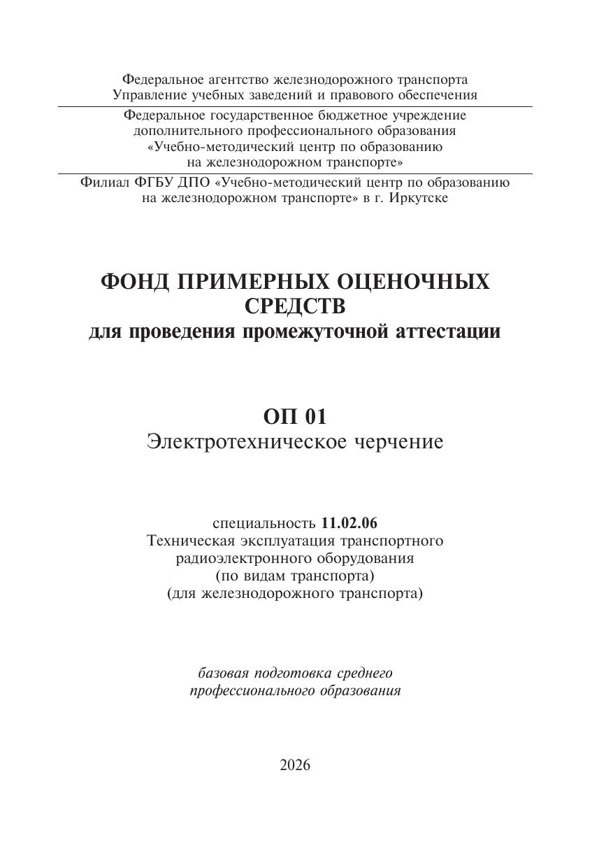Григорьева, Ю.В. Фонд примерных оценочных средств для проведения промежуточной аттестации ОП 01 Электротехническое черчение : фонд оценочных средств / Ю. В. Григорьева. — Москва : УМЦ ЖДТ, 2026. — 48 с. — Текст : электронный // УМЦ ЖДТ : электронная библиотека. — URL: https://umczdt.ru/books/1245/300739/ (дата обращения 15.04.2026). — Режим доступа: по подписке.