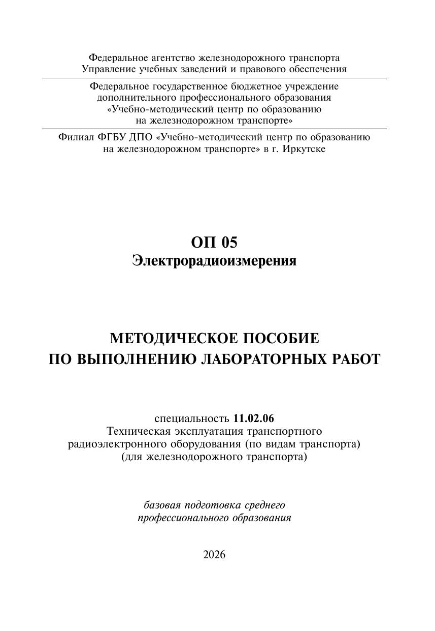 Кабанова, А.А. Методическое пособие по выполнению лабораторных работ ОП 05 Электрорадиоизмерения : методическое пособие / А. А. Кабанова. — Москва : УМЦ ЖДТ, 2026. — 64 с. — Текст : электронный // УМЦ ЖДТ : электронная библиотека. — URL: https://umczdt.ru/books/1251/300740/ (дата обращения 15.04.2026). — Режим доступа: по подписке.