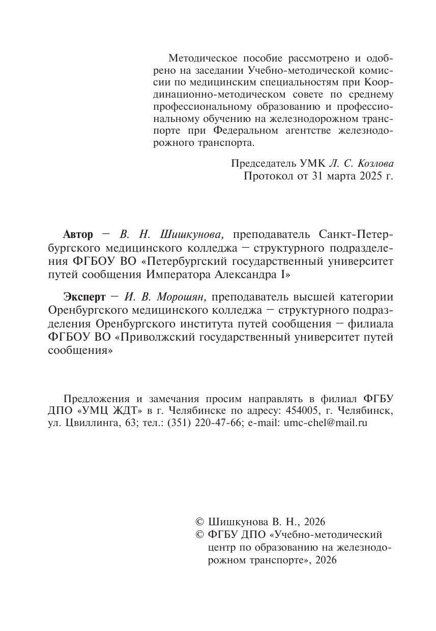 Шишкунова, В.Н. Методическое пособие Организация самостоятельной работы для обучающихся очной формы обучения образовательных организаций среднего профессионального образования ОП 02 Основы патологии : методическое пособие / В. Н. Шишкунова. — Москва : УМЦ ЖДТ, 2026. — 76 с. — Текст : электронный // УМЦ ЖДТ : электронная библиотека. — URL: https://umczdt.ru/books/1261/300650/ (дата обращения 18.04.2026). — Режим доступа: по подписке.