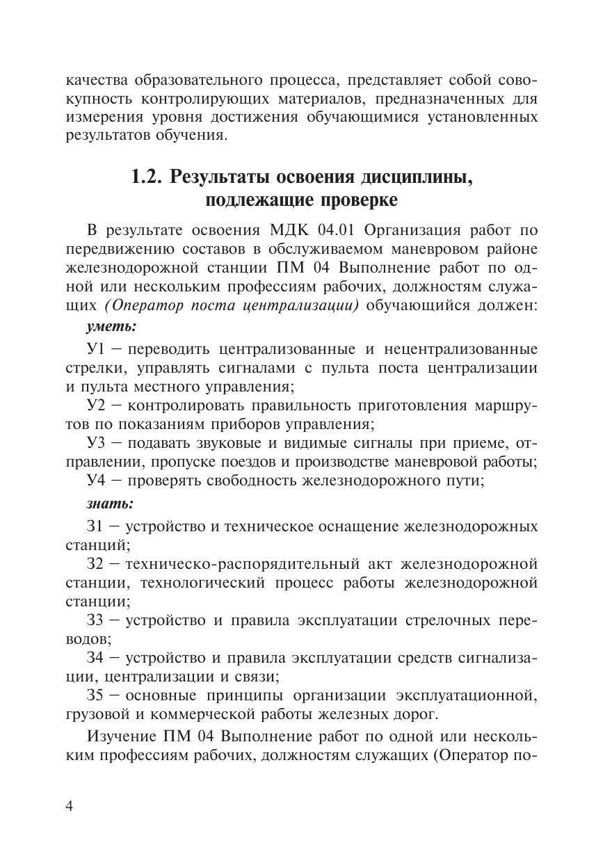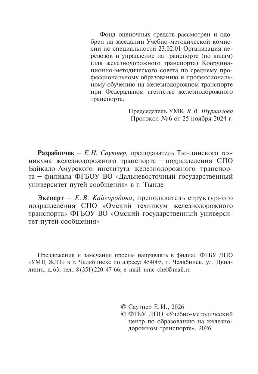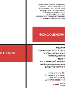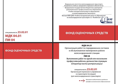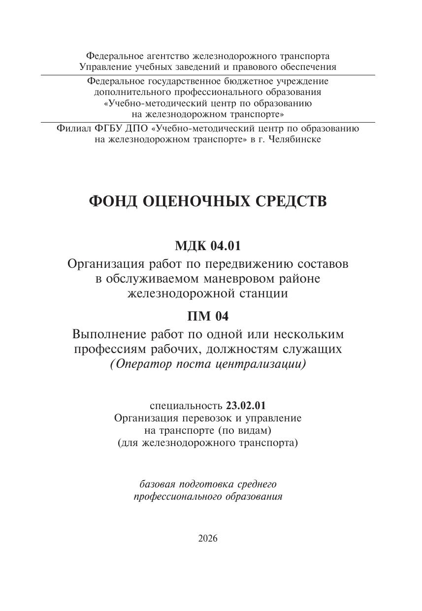 Саутнер, Е.И. Фонд оценочных средств МДК 04.01 Организация работ по передвижению составов в обслуживаемом маневровом районе железнодорожной станции ПМ 04 Выполнение работ по одной или нескольким профессиям рабочих, должностям служащих (Оператор поста централизации) : методическое пособие / Е. И. Саутнер. — Москва : УМЦ ЖДТ, 2026. — 68 с. — Текст : электронный // УМЦ ЖДТ : электронная библиотека. — URL: https://umczdt.ru/books/1265/300657/ (дата обращения 29.04.2026). — Режим доступа: по подписке.