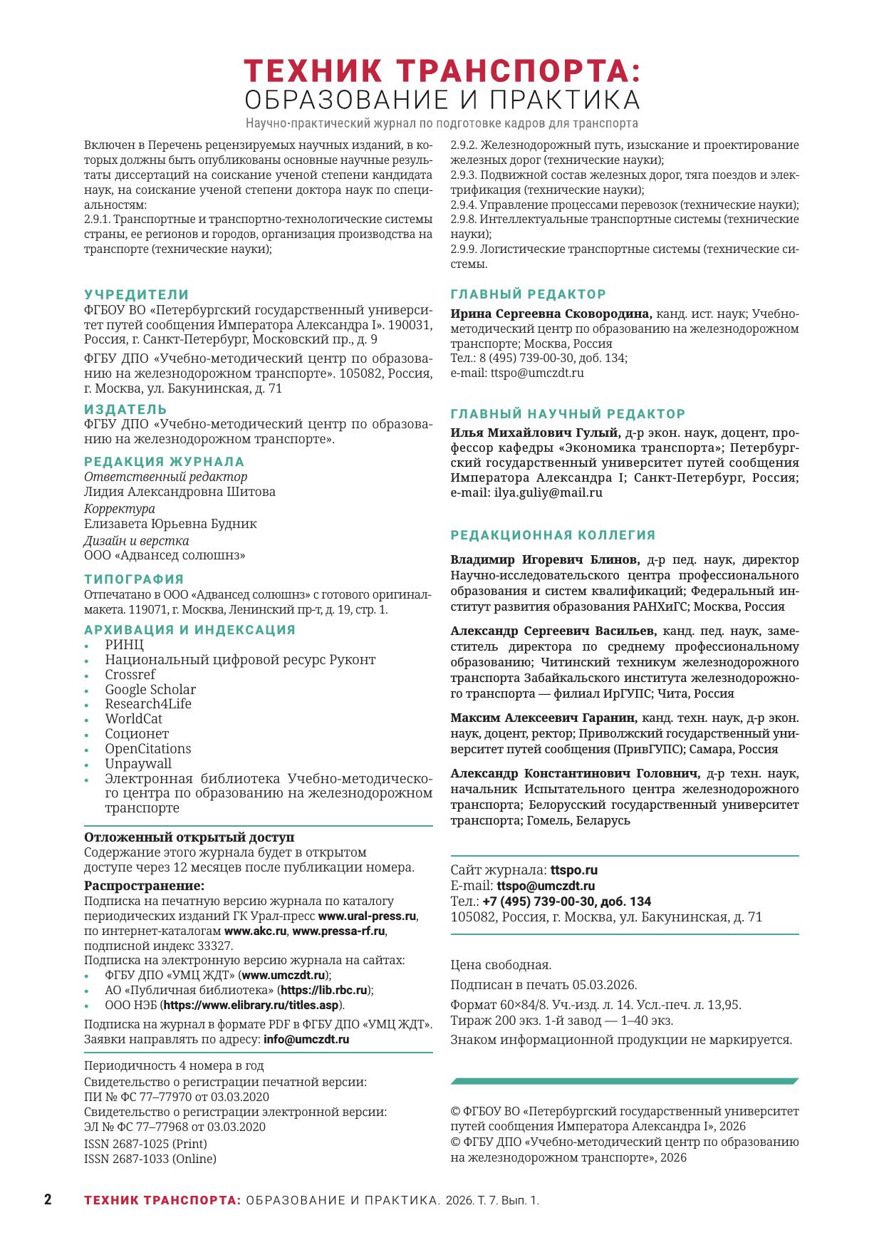 Техник транспорта: образование и практика. 2026. Том 7. Выпуск 1