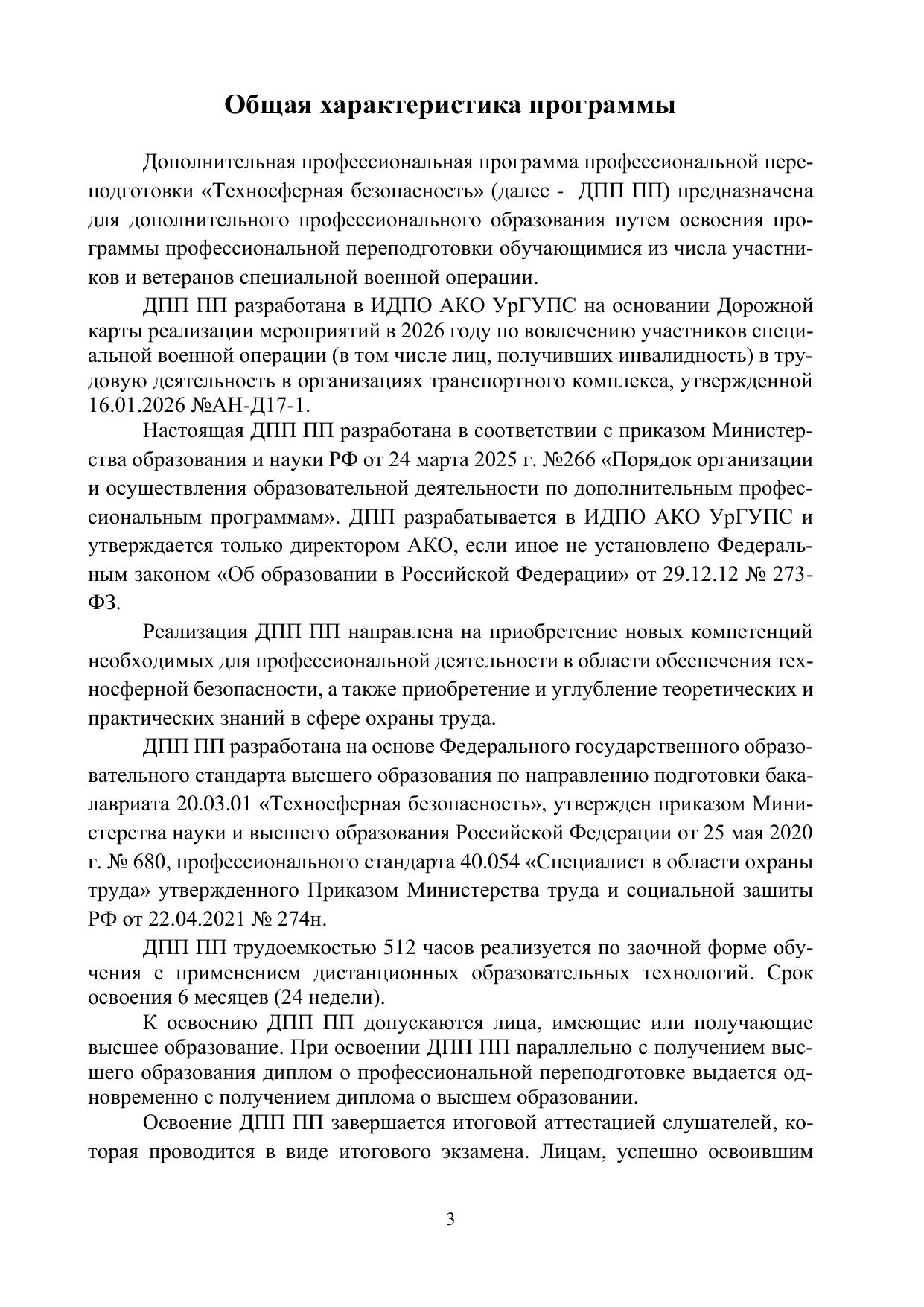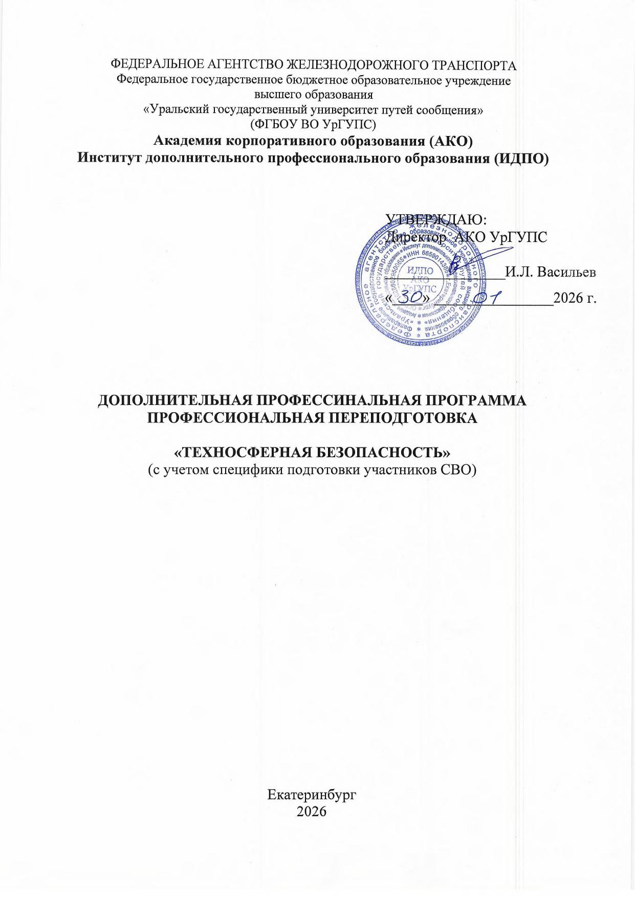Техносферная безопасность : программа профессиональной переподготовки / . — Екатеринбург : УрГУПС, 2026. — 21 с. — Текст : электронный // УМЦ ЖДТ : электронная библиотека. — URL: https://umczdt.ru/books/1306/299881/ (дата обращения 15.04.2026). — Режим доступа: по подписке.