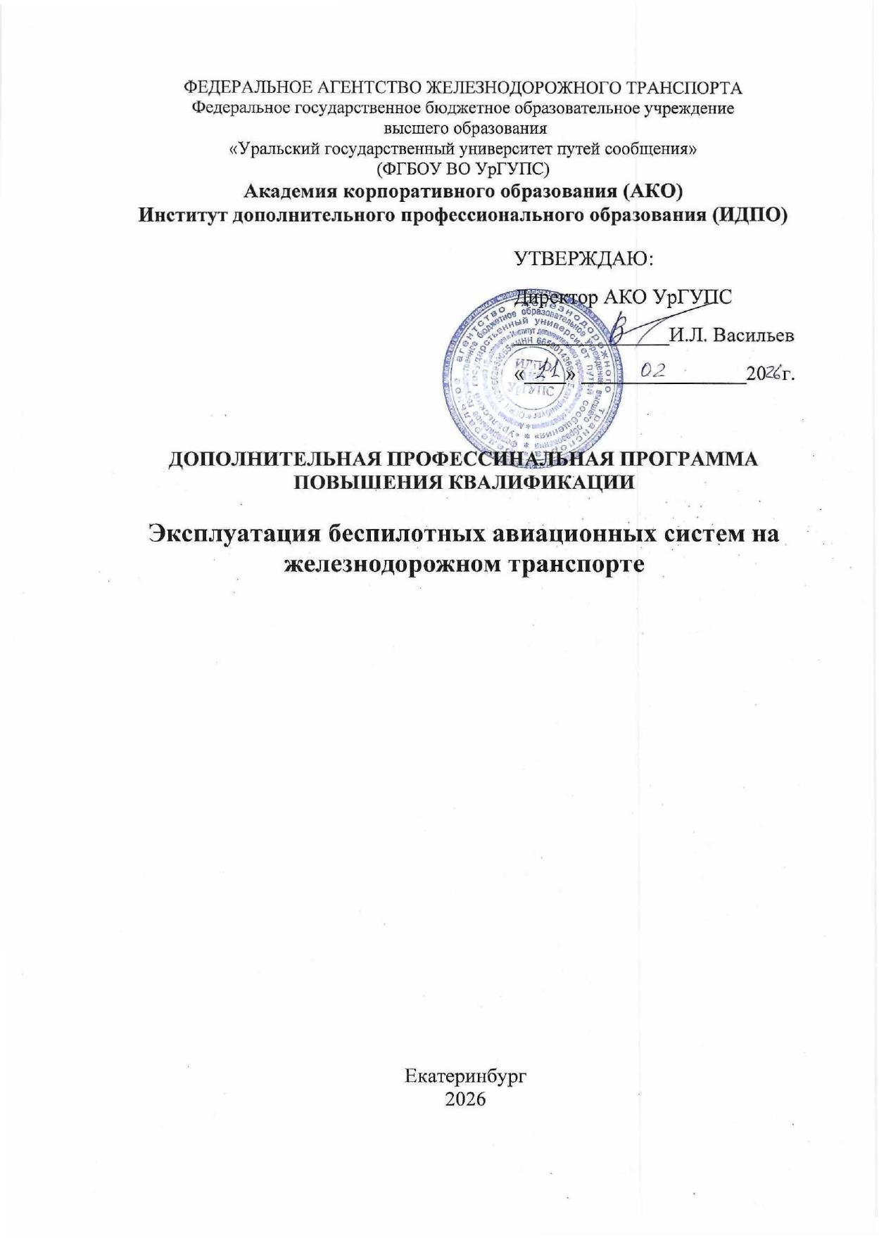Эксплуатация беспилотных авиационных систем : программа повышения квалификации / . — Екатеринбург : УрГУПС, 2026. — 16 с. — Текст : электронный // УМЦ ЖДТ : электронная библиотека. — URL: https://umczdt.ru/books/1389/299893/ (дата обращения 15.04.2026). — Режим доступа: по подписке.