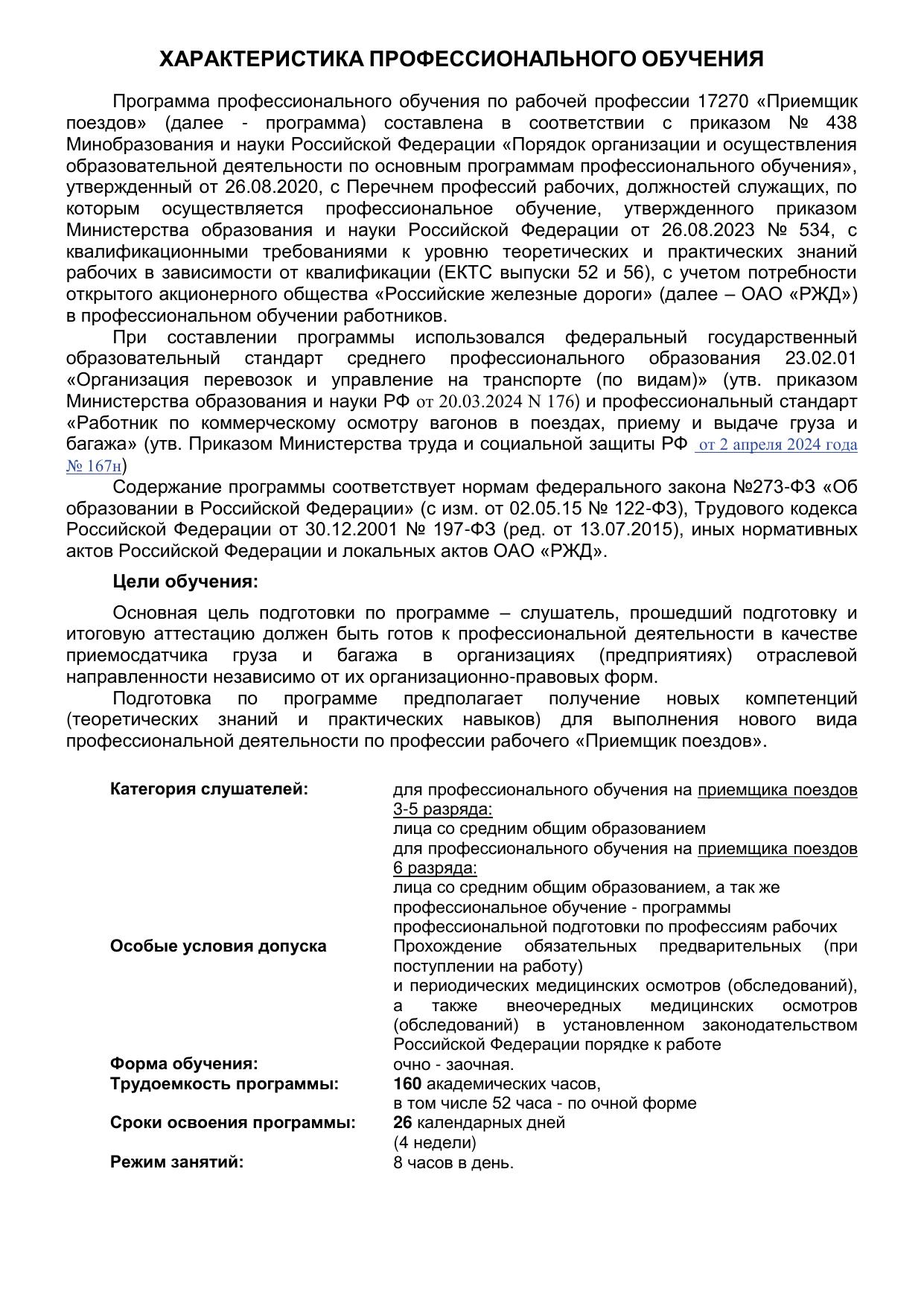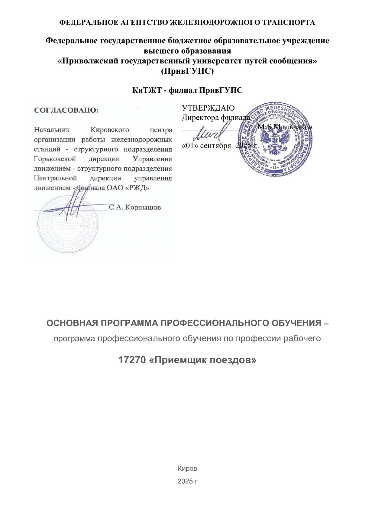 Приемщик поездов : программа профессиональной подготовки / . — Киров : КиТЖТ - филиал ПривГУПС, 2025. — 74 с. — Текст : электронный // УМЦ ЖДТ : электронная библиотека. — URL: https://umczdt.ru/books/1311/299847/ (дата обращения 16.04.2026). — Режим доступа: по подписке.