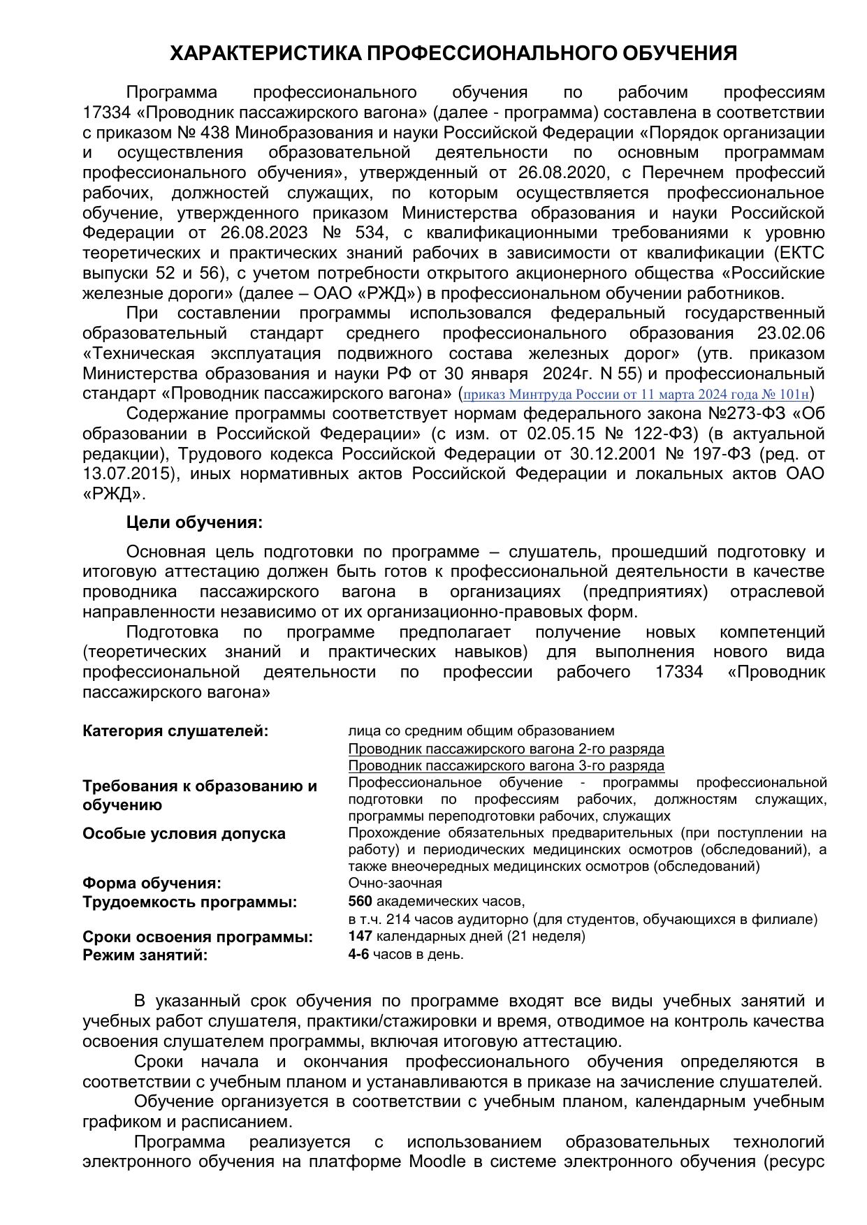 Категория слушателей: лица со средним общим образованием, проводник пассажирского вагона 2-го разряда, проводник пассажирского вагона 3-го разряда. Форма обучения: очно-заочная, 560 часов. Ссылка на программу на сайте разработчика: