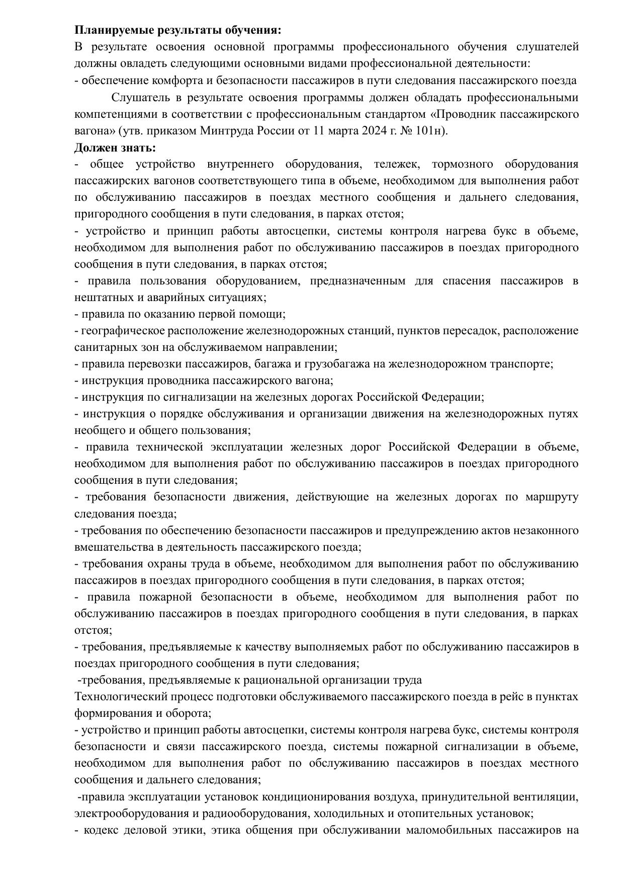 Проводник пассажирского вагона : программа профессиональной подготовки / . — Казань : КТЖТ- филиал ПривГУПС, 2025. — 45 с. — Текст : электронный // УМЦ ЖДТ : электронная библиотека. — URL: https://umczdt.ru/books/1311/299864/ (дата обращения 16.04.2026). — Режим доступа: по подписке.
