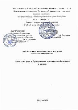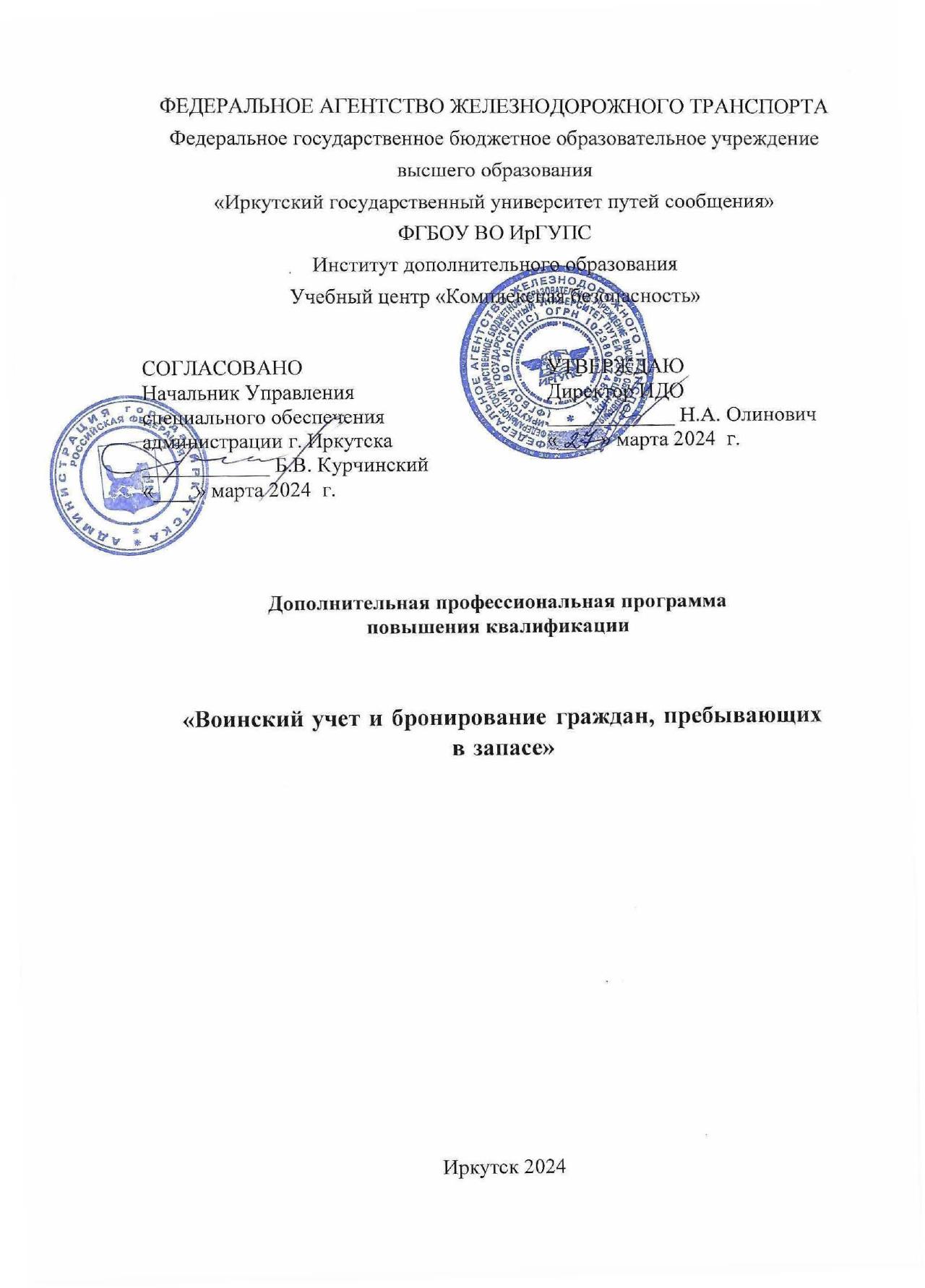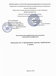 Воинский учет и бронирование граждан, пребывающих в запасе : программа повышения квалификации / . — Иркутск : ИрГУПС, 2024. — 12 с. — Текст : электронный // УМЦ ЖДТ : электронная библиотека. — URL: https://umczdt.ru/books/1319/299676/ (дата обращения 12.03.2026). — Режим доступа: по подписке.