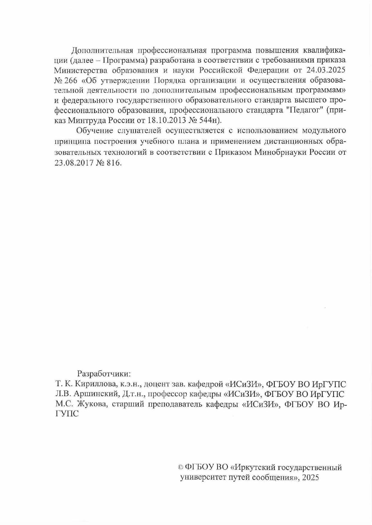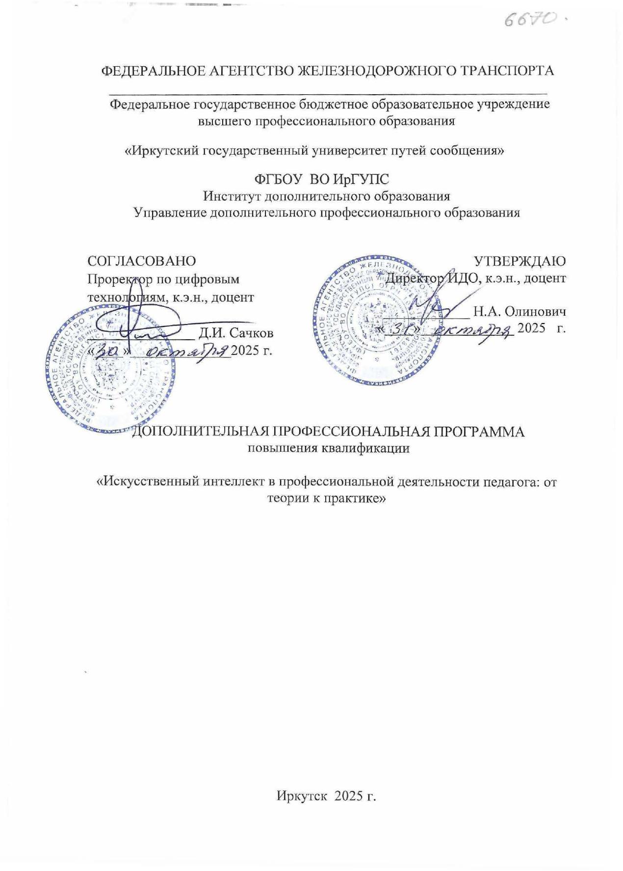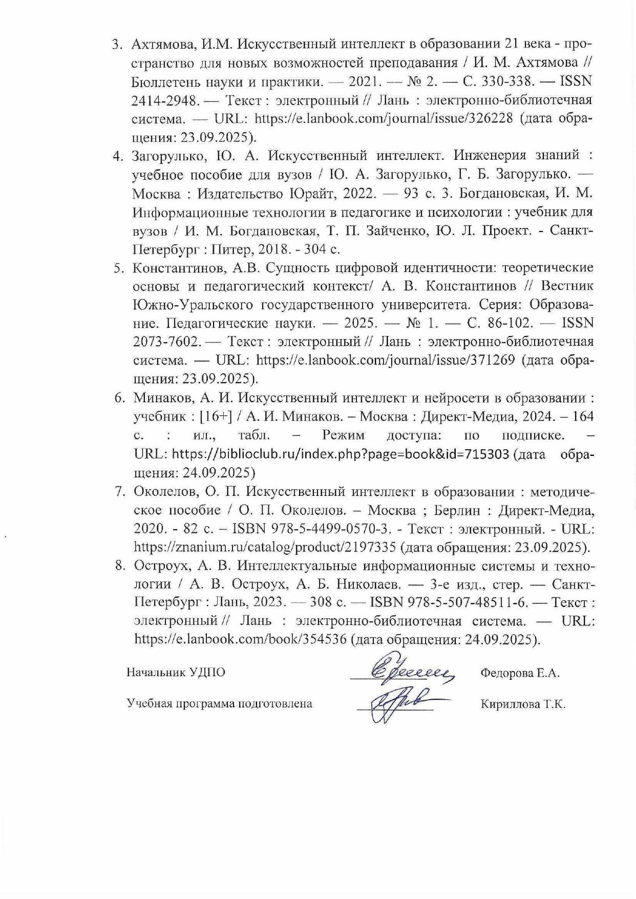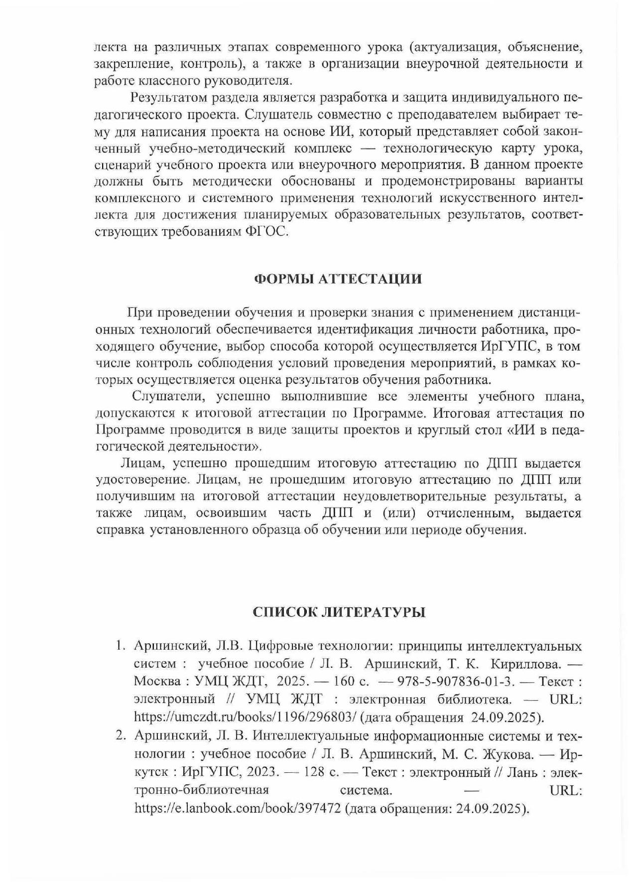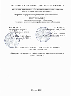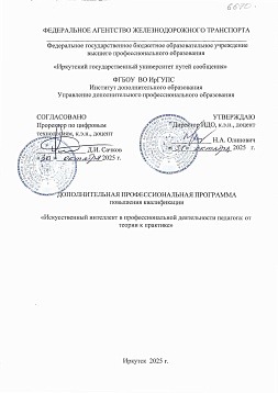 Искусственный интеллект в профессиональной деятельности педагога: от теории к практике : программа повышения квалификации / . — Иркутск : ИрГУПС, 2025. — 10 с. — Текст : электронный // УМЦ ЖДТ : электронная библиотека. — URL: https://umczdt.ru/books/1319/299678/ (дата обращения 15.04.2026). — Режим доступа: по подписке.