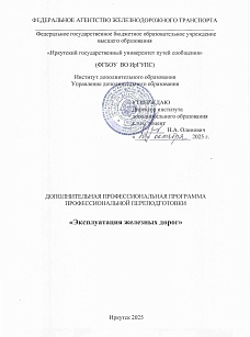 Эксплуатация железных дорог : программа профессиональной переподготовки / . — Иркутск : ИрГУПС, 2025. — 20 с. — Текст : электронный // УМЦ ЖДТ : электронная библиотека. — URL: https://umczdt.ru/books/1319/299696/ (дата обращения 16.04.2026). — Режим доступа: по подписке.