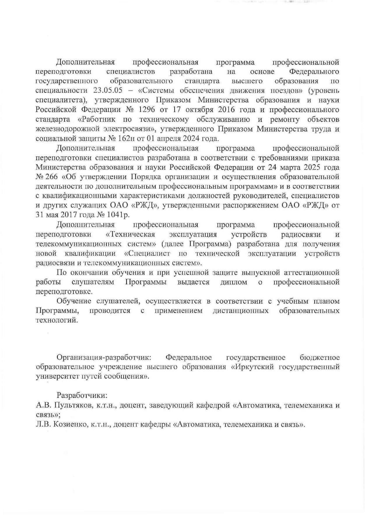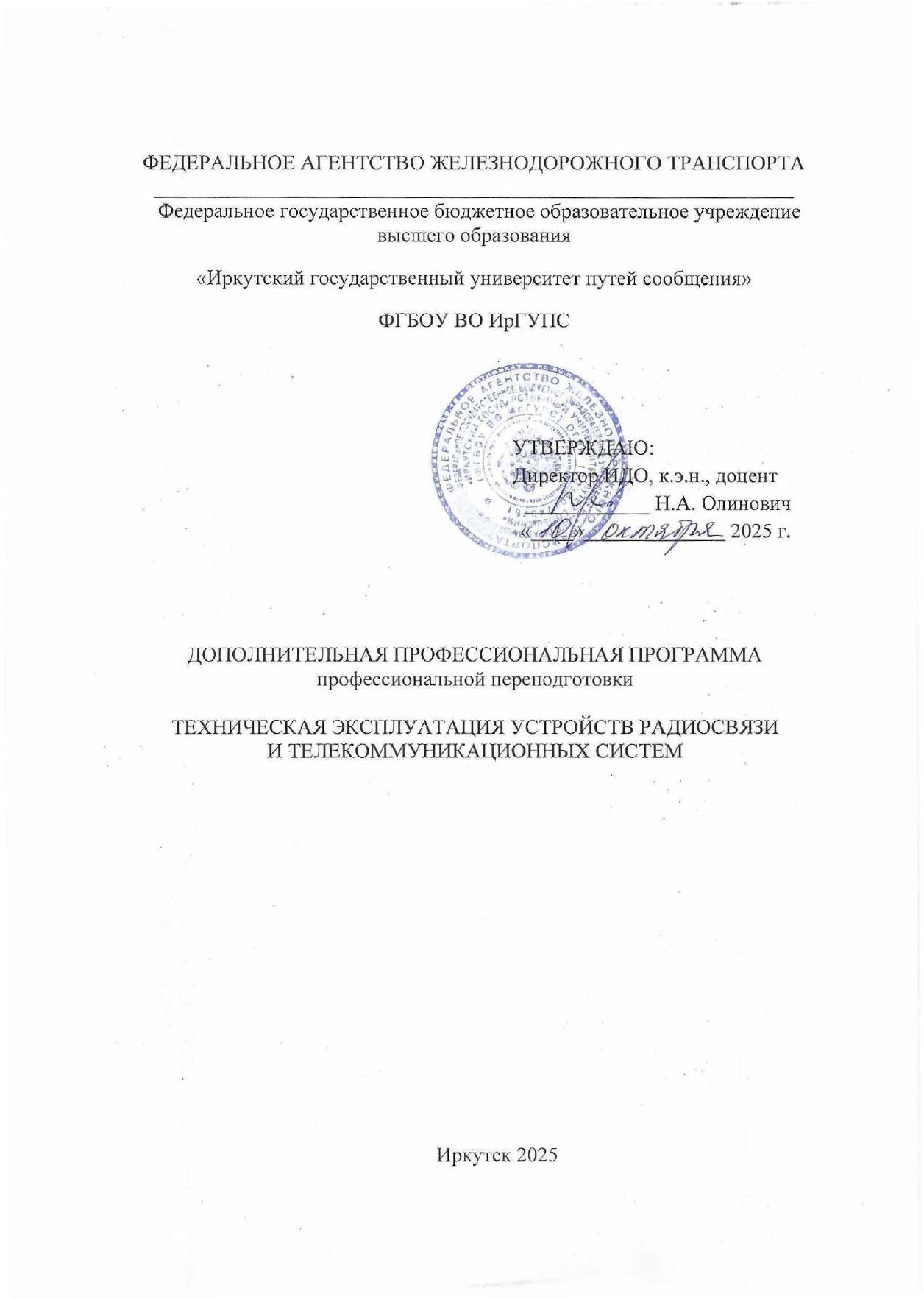 Техническая эксплуатация устройств радиосвязи и телекоммуникационных систем : программа профессиональной переподготовки / . — Иркутск : ИрГУПС, 2025. — 22 с. — Текст : электронный // УМЦ ЖДТ : электронная библиотека. — URL: https://umczdt.ru/books/1319/299699/ (дата обращения 17.04.2026). — Режим доступа: по подписке.