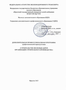 Строительство железных дорог. Организация строительного производства : программа профессиональной переподготовки / . — Иркутск : ИрГУПС, 2025. — 16 с. — Текст : электронный // УМЦ ЖДТ : электронная библиотека. — URL: https://umczdt.ru/books/1319/299701/ (дата обращения 19.04.2026). — Режим доступа: по подписке.