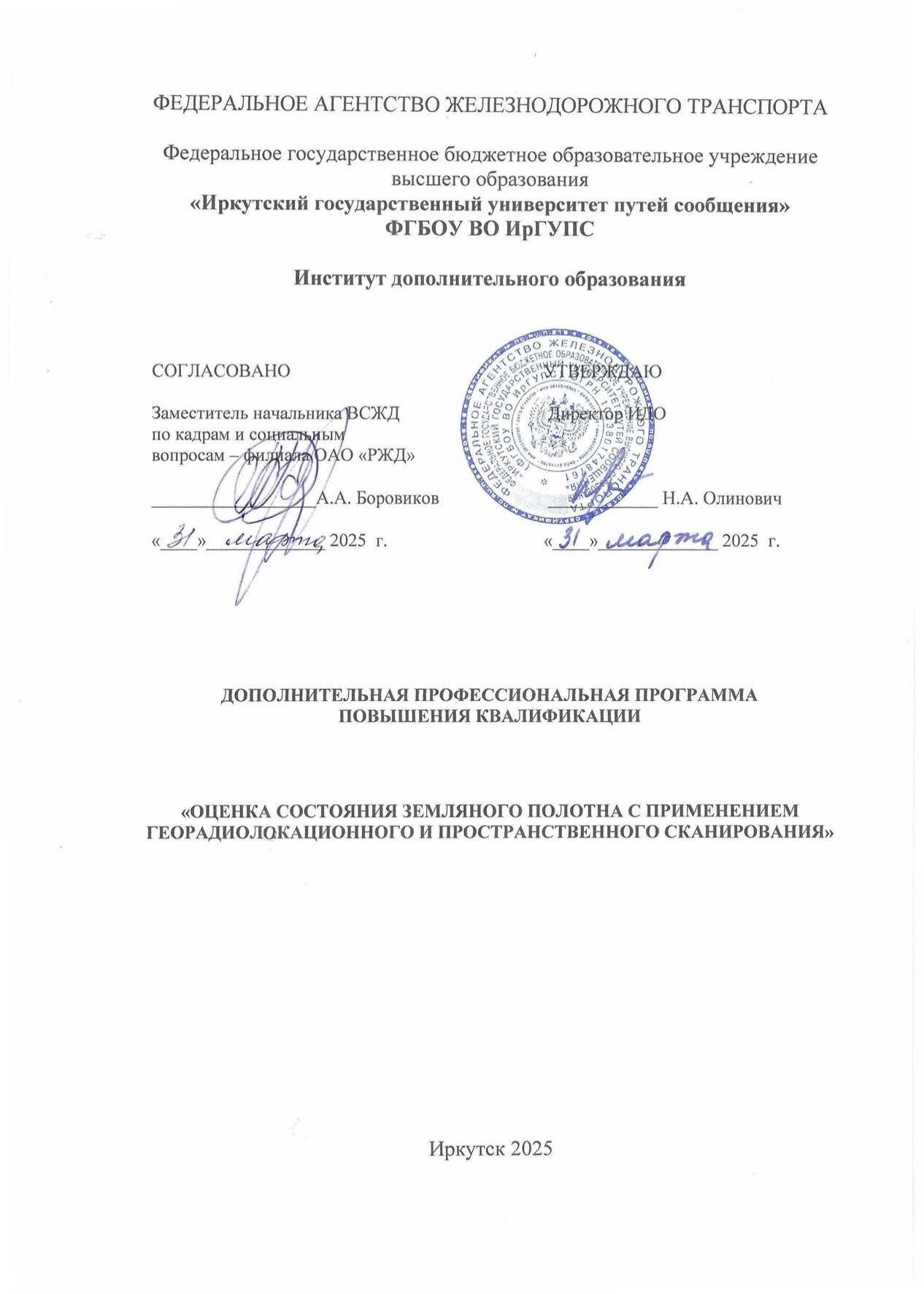 Оценка состояния земляного полотна с применением георадиолокационного и пространственного сканирования : программа повышения квалификации / . — Иркутск : ИрГУПС, 2025. — 13 с. — Текст : электронный // УМЦ ЖДТ : электронная библиотека. — URL: https://umczdt.ru/books/1385/299674/ (дата обращения 12.03.2026). — Режим доступа: по подписке.
