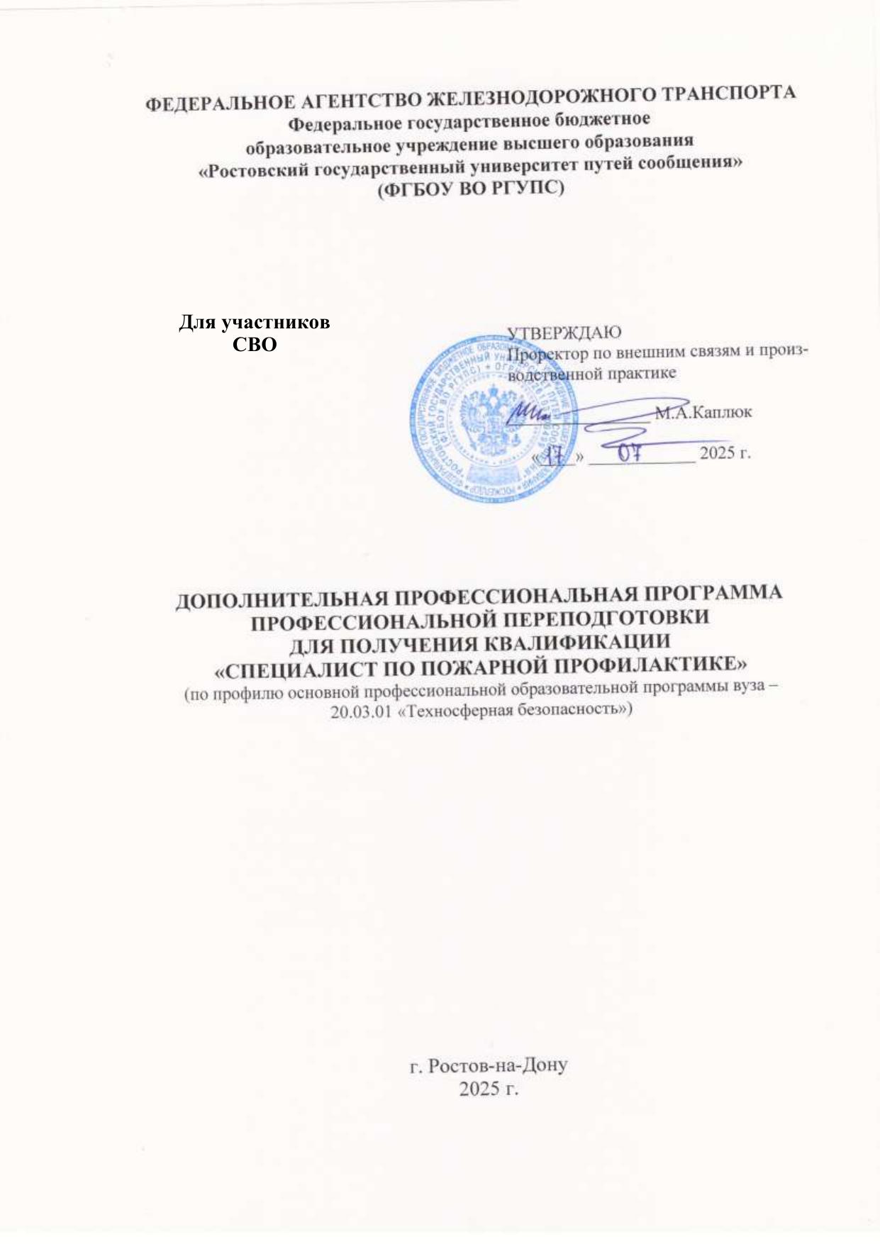 Специалист по пожарной профилактике : программа профессиональной переподготовки / . — Ростов-на-Дону : РГУПС, 2025. — 30 с. — Текст : электронный // УМЦ ЖДТ : электронная библиотека. — URL: https://umczdt.ru/books/1388/299710/ (дата обращения 06.03.2026). — Режим доступа: по подписке.