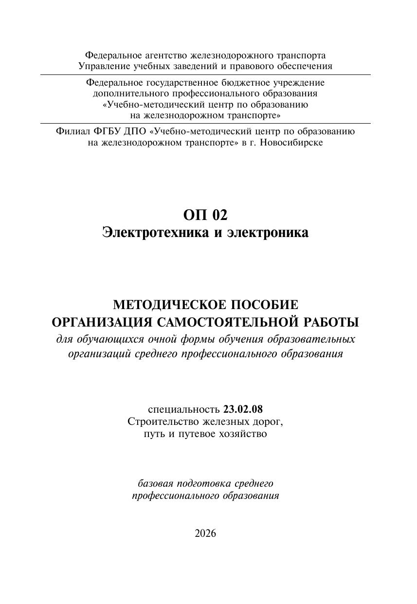 Андрусенко, Т.Н. Методическое пособие Организация самостоятельной работы для обучающихся очной формы обучения образовательных организаций среднего профессионального образования ОП 02 Электротехника и электроника : методическое пособие / Т. Н. Андрусенко. — Москва : УМЦ ЖДТ, 2026. — 60 с. — Текст : электронный // УМЦ ЖДТ : электронная библиотека. — URL: https://umczdt.ru/books/1390/300709/ (дата обращения 11.04.2026). — Режим доступа: по подписке.