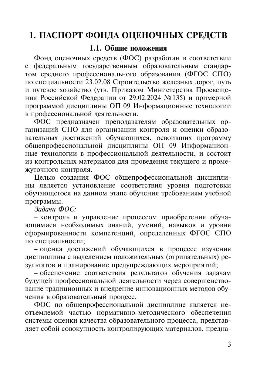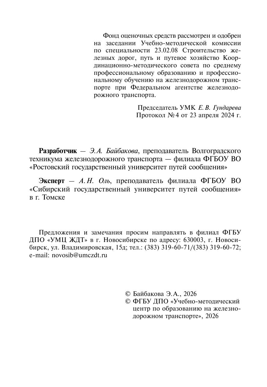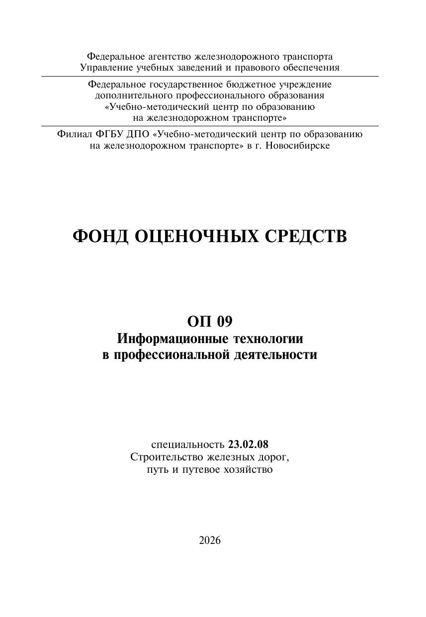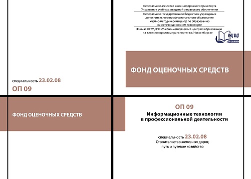 Байбакова, Э.А. Фонд оценочных средств ОП 09 Информационные технологии в профессиональной деятельности : фонд оценочных средств / Э. А. Байбакова. — Москва : УМЦ ЖДТ, . — с. — Текст : электронный // УМЦ ЖДТ : электронная библиотека. — URL: https://umczdt.ru/books/1391/300711/ (дата обращения 28.04.2026). — Режим доступа: по подписке.