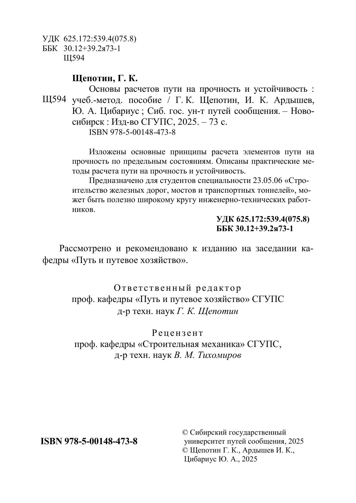 Щепотин, Г.К. Основы расчетов пути на прочность и устойчивость : учебно-методическое пособие / Г. К. Щепотин, И. К. Ардышев, Ю. А. Цибариус. — Новосибирск : СГУПС, 2025. — 73 с. — 978-5-00148-473-8. — Текст : электронный // УМЦ ЖДТ : электронная библиотека. — URL: https://umczdt.ru/books/997/299307/ (дата обращения 08.02.2026). — Режим доступа: по подписке.