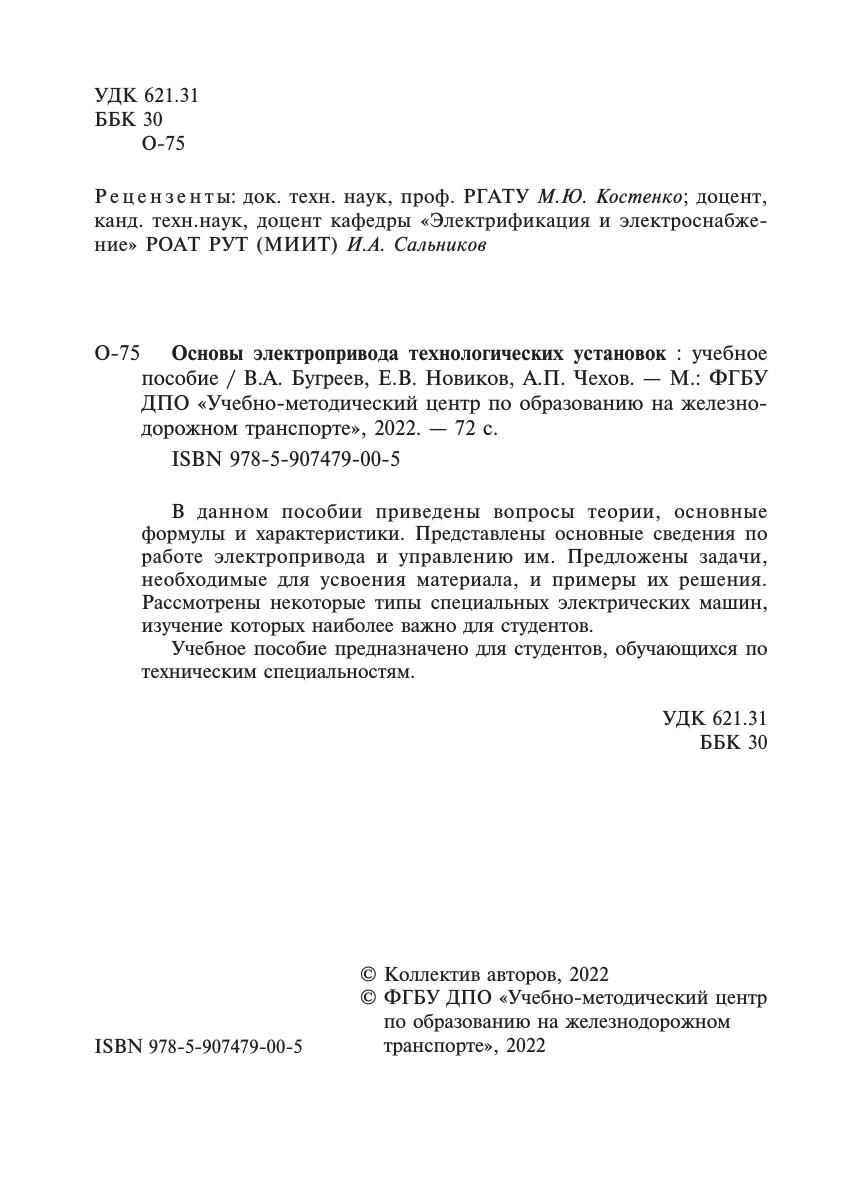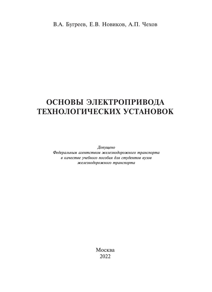 Бугреев, В.А. Основы электропривода технологических установок : учебное пособие / В. А. Бугреев, Е. В. Новиков, А. П. Чехов. — Москва : УМЦ ЖДТ, 2022. — 72 с. — 978-5-907479-00-5. — Текст : электронный // УМЦ ЖДТ : электронная библиотека. — URL: https://umczdt.ru/books/1008/260758/ (дата обращения 13.02.2026). — Режим доступа: по подписке.