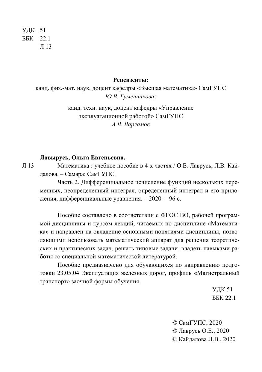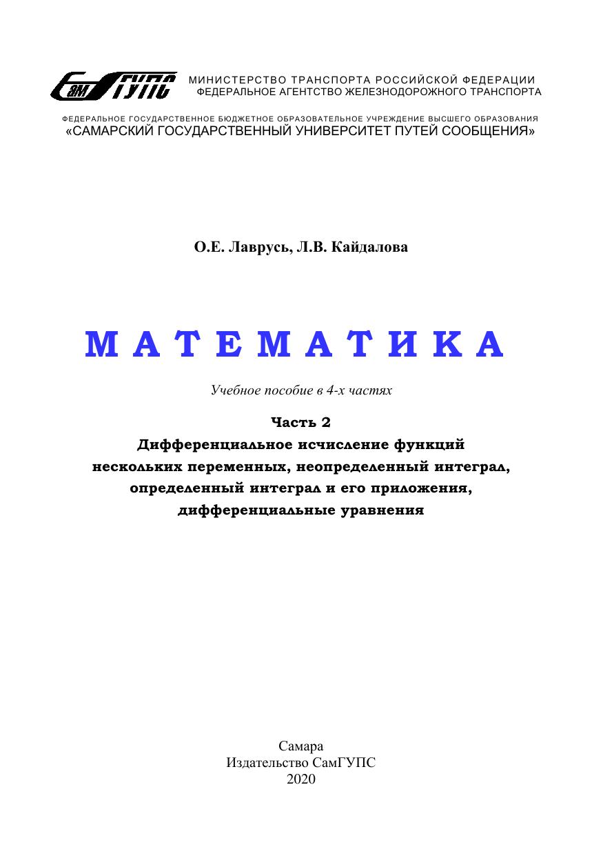 Лаврусь, О.Е. Математика. Часть 2. Дифференциальное исчисление функций нескольких переменных, неопределенный интеграл, определенный интеграл и его приложения, дифференциальные уравнения : учебное пособие / О. Е. Лаврусь, Л. В. Кайдалова. — Самара : СамГУПС, 2020. — 96 с. — Текст : электронный // УМЦ ЖДТ : электронная библиотека. — URL: https://umczdt.ru/books/1016/263540/ (дата обращения 14.12.2025). — Режим доступа: по подписке.